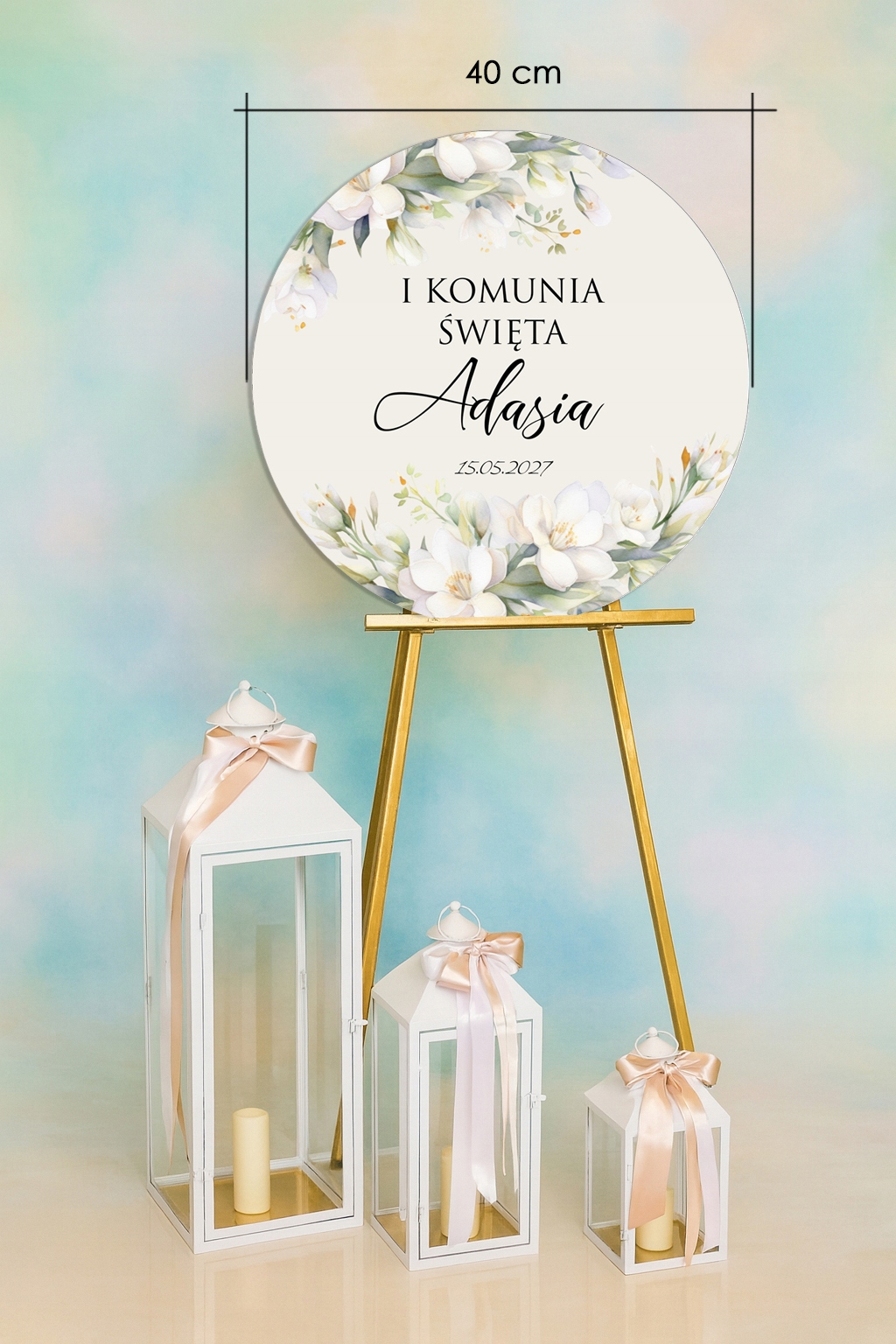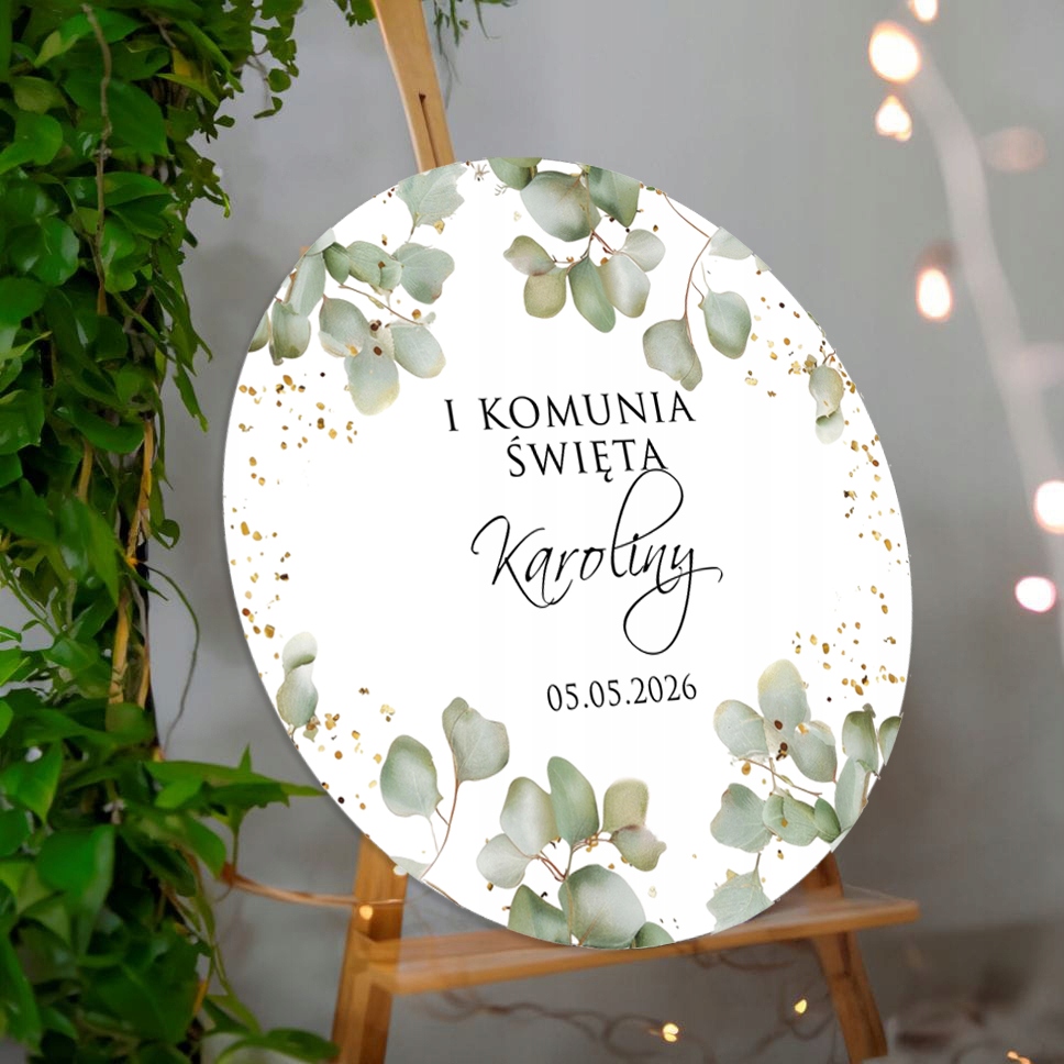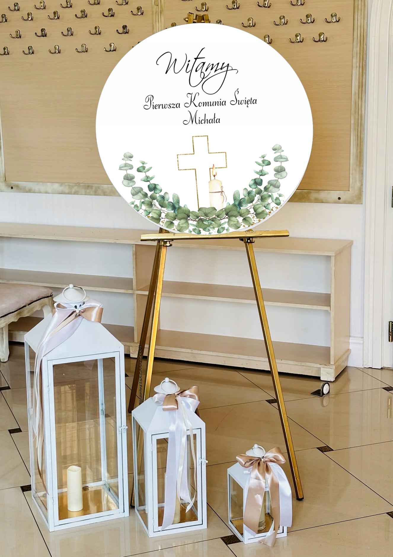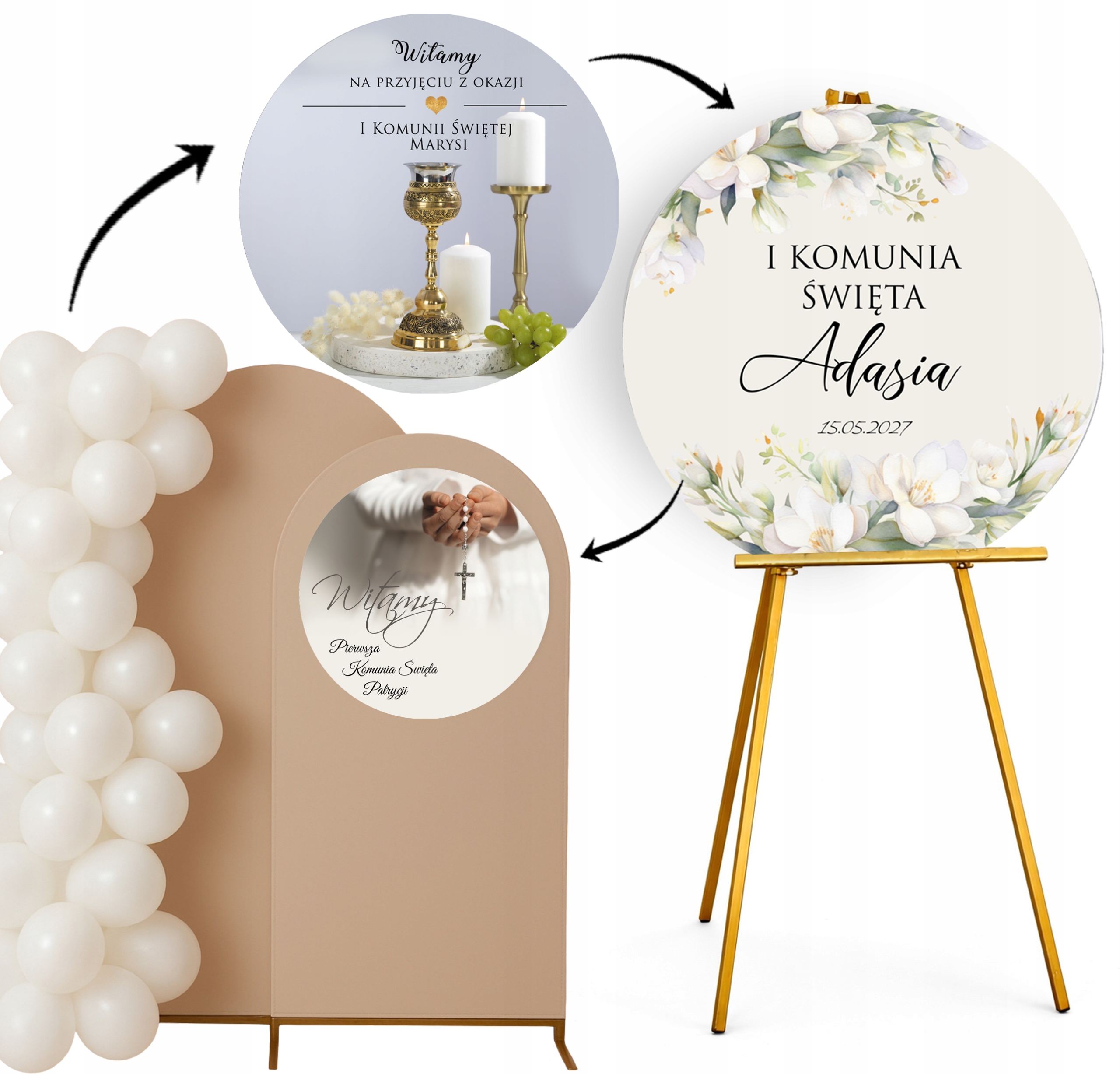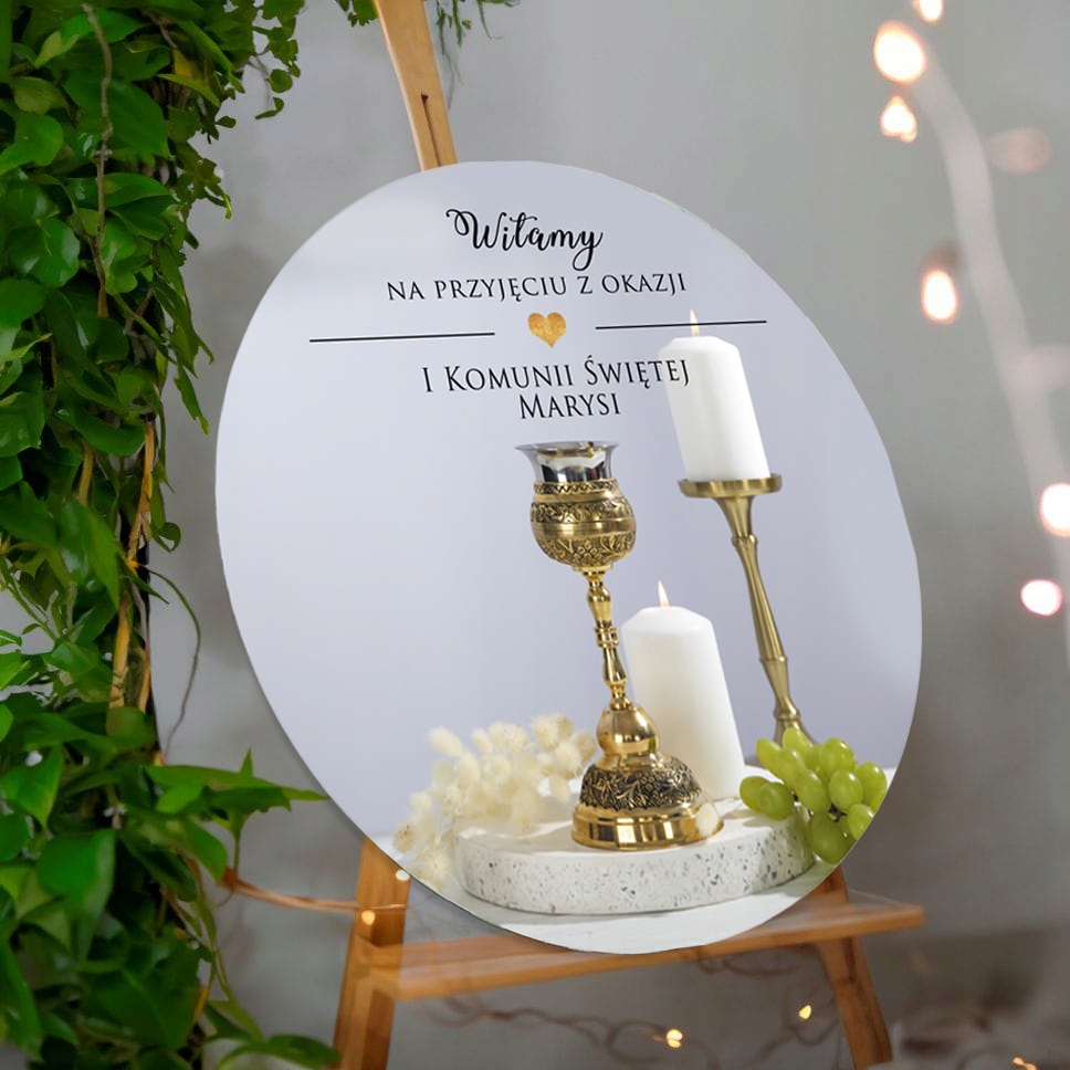 Elegancki okrągły plakat powitalny na Pierwszą Komunię Świętą, wykonany z wysokiej jakości białej płyty z połyskiem, to wyjątkowa dekoracja, która pięknie podkreśli uroczysty charakter tego dnia. Idealnie sprawdzi się przy wejściu do kościoła, sali przyjęć lub restauracji, witając gości w subtelny i nowoczesny sposób.