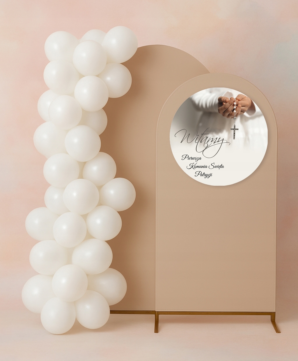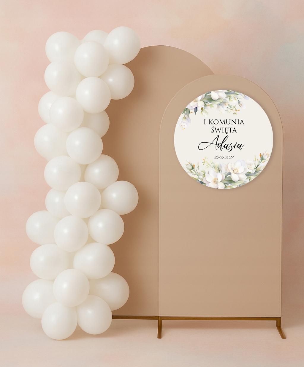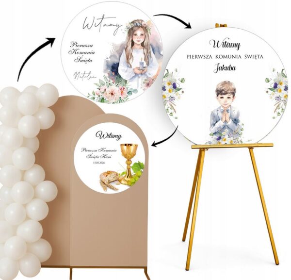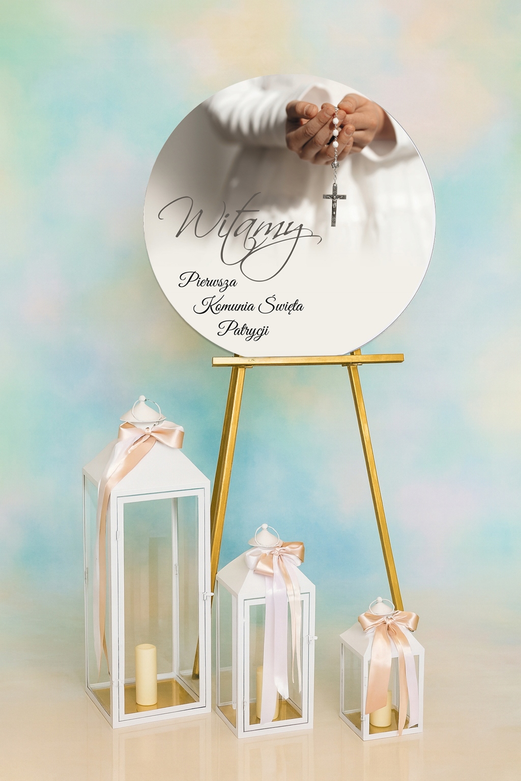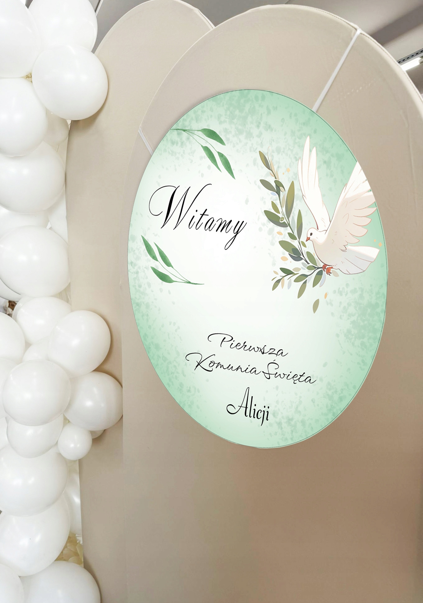 Elegancki okrągły plakat powitalny na Pierwszą Komunię Świętą, wykonany z wysokiej jakości białej płyty z połyskiem, to wyjątkowa dekoracja, która pięknie podkreśli uroczysty charakter tego dnia. Idealnie sprawdzi się przy wejściu do kościoła, sali przyjęć lub restauracji, witając gości w subtelny i nowoczesny sposób.