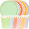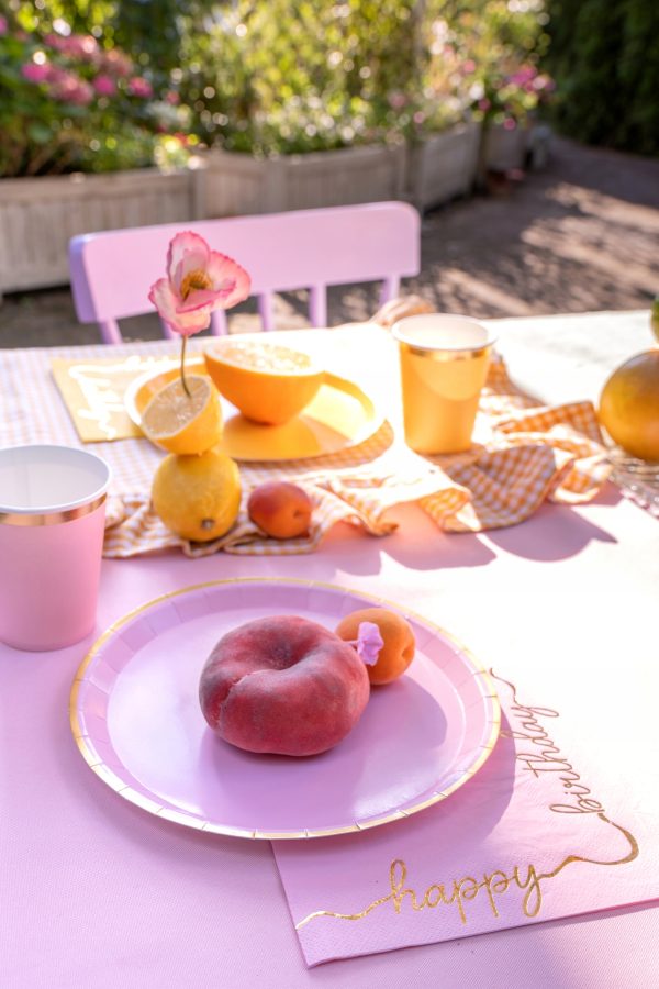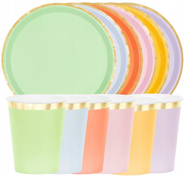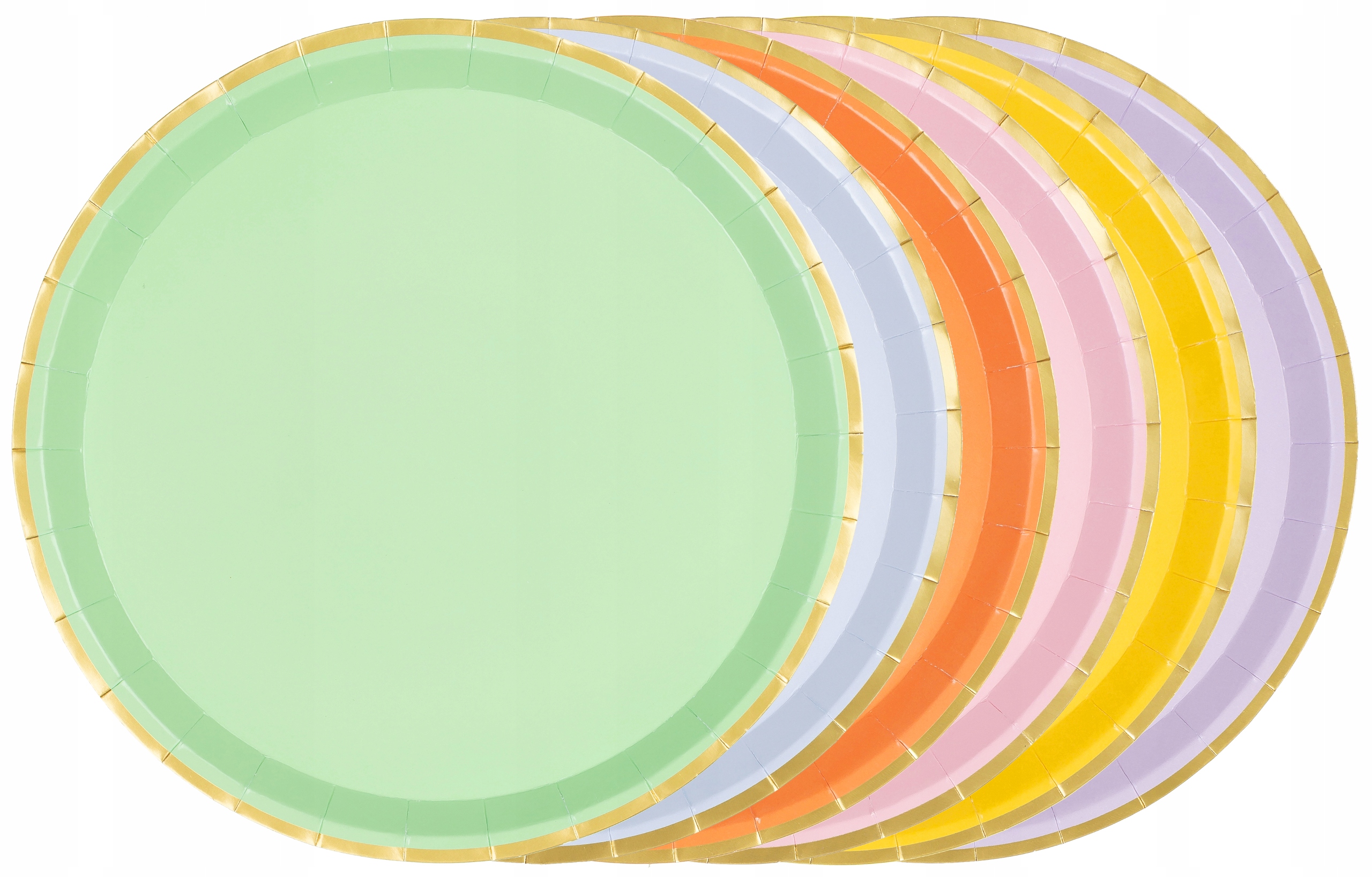 Organizujesz przyjęcie urodzinowe, piknik lub inną imprezę, na której nie może zabraknąć praktycznych i estetycznych dodatków? Zestaw papierowych talerzyków zdecydowanie będzie dobrym wyborem! W skład zestawu wchodzi aż 6 papierowych talerzy w różnych pastelowych kolorach: żółtym, zielonym, niebieskim, pomarańczowym, fioletowym i różowym. Dodatkowo brzegi wszystkich talerzyków ozdobione zostały złotym kolorem o błyszczącej, metalicznej strukturze.