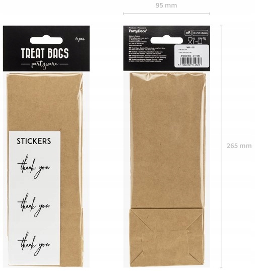 ✅ Ten zestaw Torebek na słodycze zawiera 6 białych naklejek z napisem “Thank you”, które dodadzą uroku Twoim słodkim upominkom. Wymiary po złożeniu wynoszą około 8x18x6 cm, co czyni je idealnym rozmiarem do pakowania różnych rodzajów smakołyków.