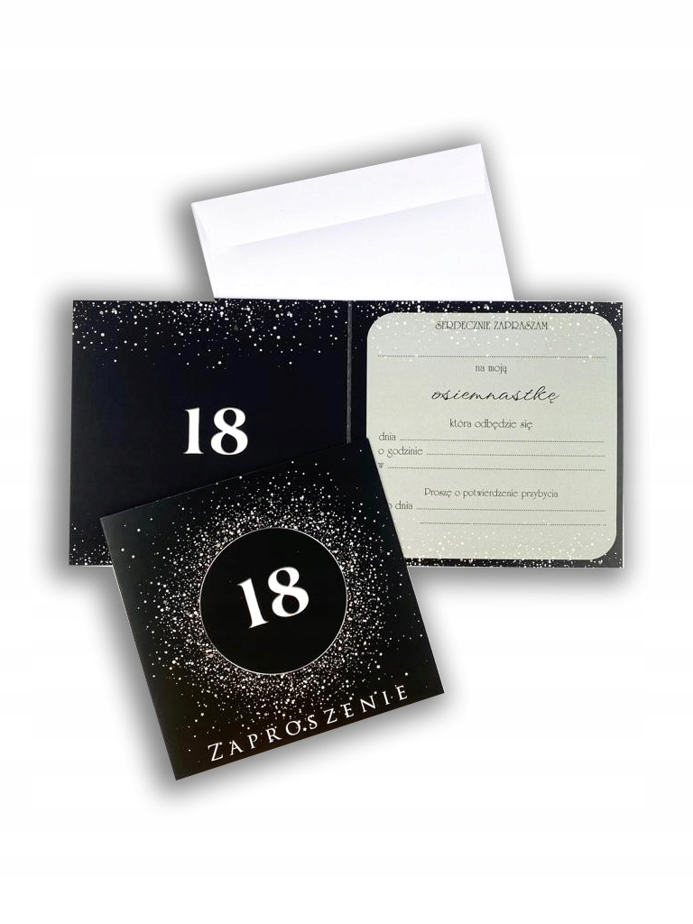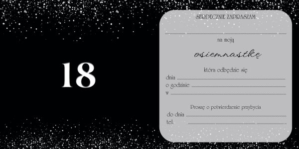 Zaproszenia na 18 URODZINY osiemnastkę zaproszenia + koperta SREBRNO CZARNE