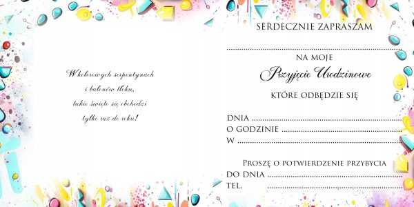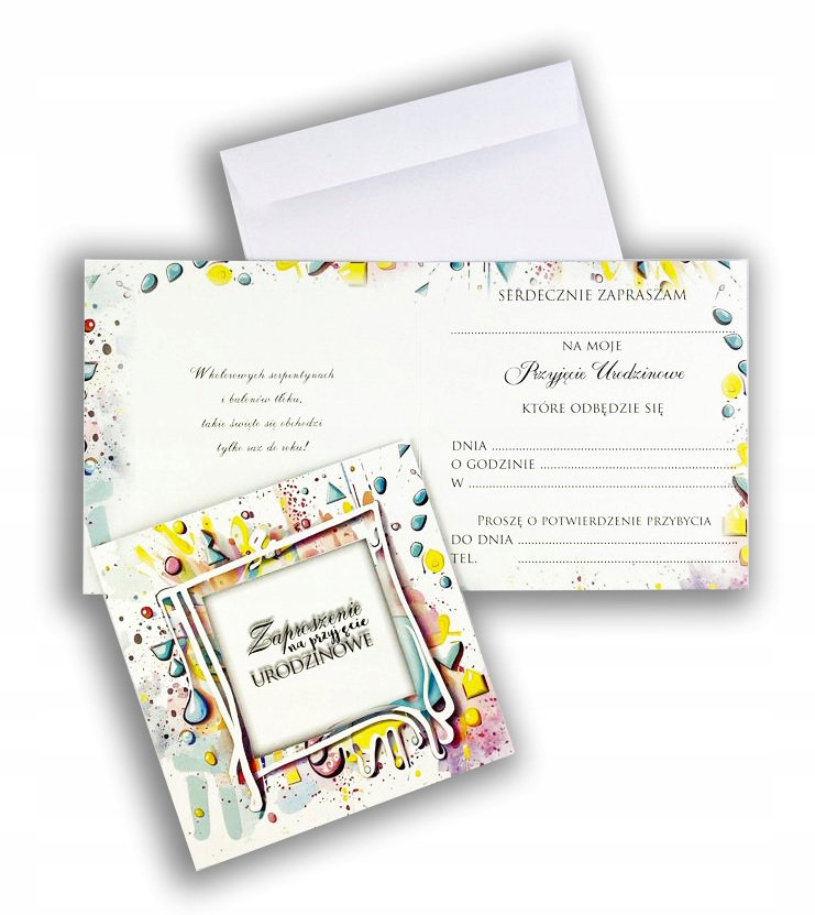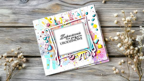 Zaproszenie na URODZINY dla nastolatki dziecka Urodzinki KOLOROWE z kopertą