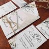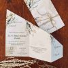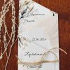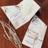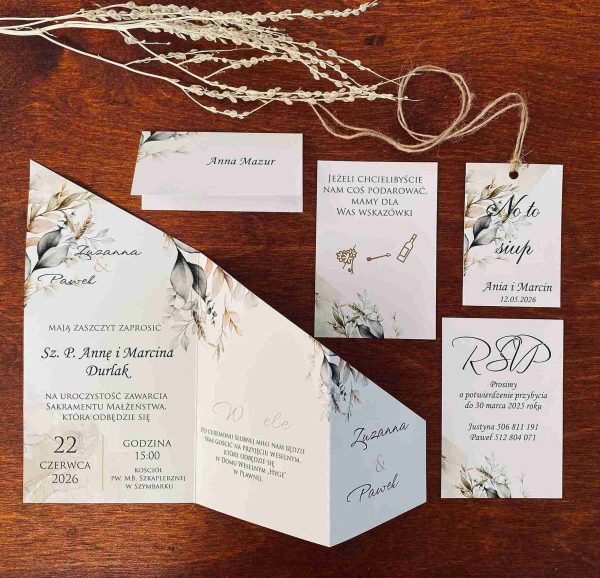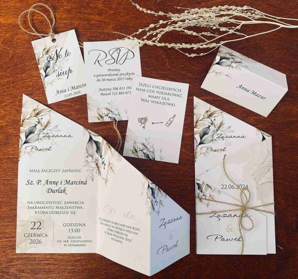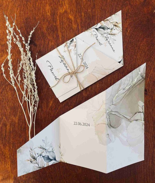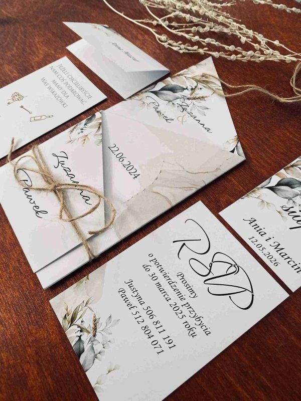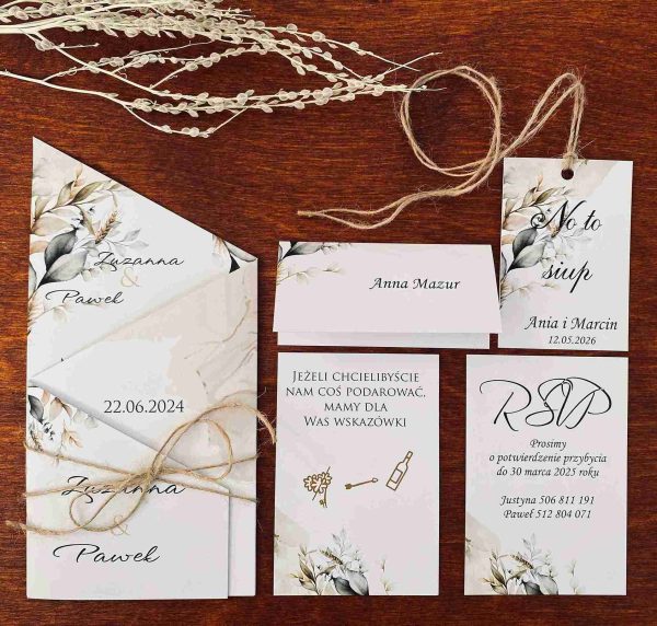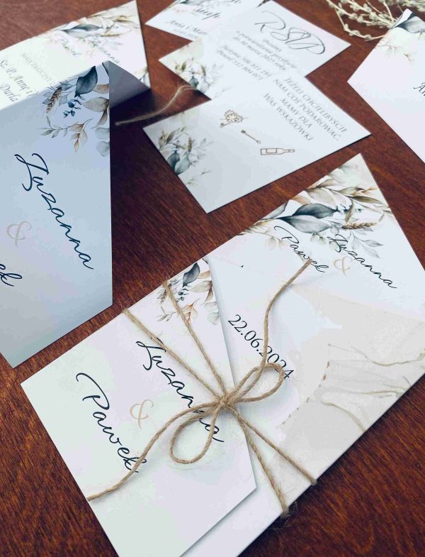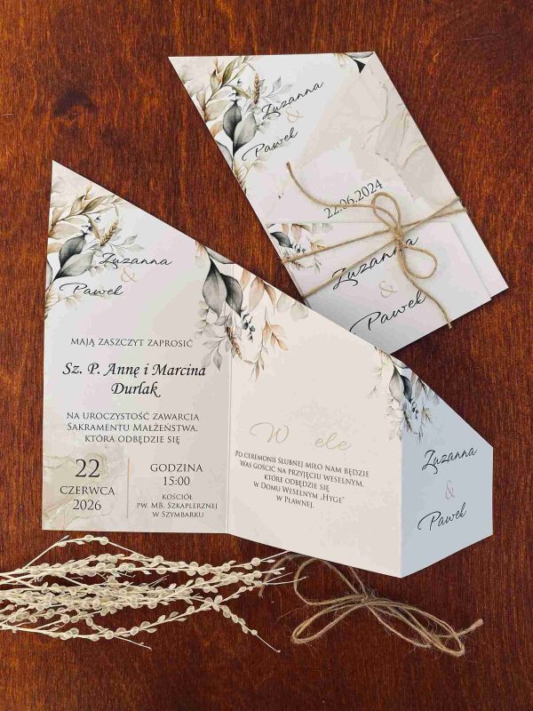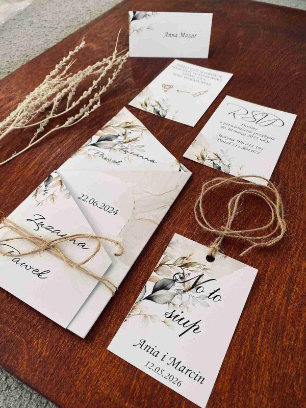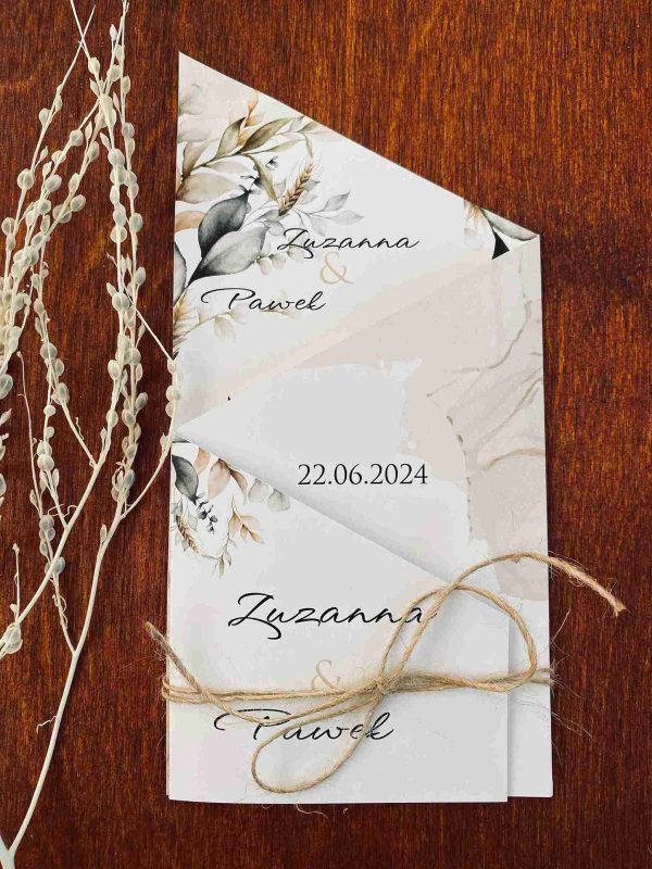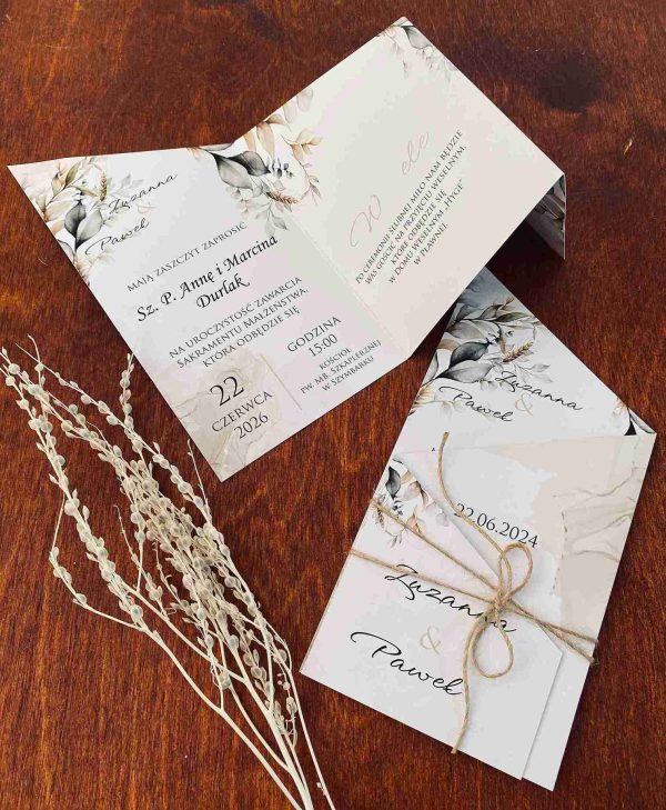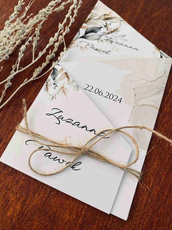 Klasyczne zaproszenia zazwyczaj cechują się elegancją, prostotą i wyrafinowanym stylem, pozostając zawsze ponadczasowe. Nasza propozycja zaproszenia z motywem liści w różnych odcieniach zieleni i brązu, wpisuje się w klasykę przyjęcia w stylu rustykalnym, niosąc przesłanie lekkości i świeżości. Połączenie zaproszenia z naturalnym sznurkiem tworzy rustykalny efekt. Wybór eleganckiej czcionki, nadaje formalny charakter, a ważne informacje, takie jak imiona, data i miejsce, są wyraźnie wyróżnione. Zaproszenie utrzymane są w stonowanej kolorystyce bieli, kremu, pastelowej zieleni i brązu wpisuje się w ponadczasowy styl, a wyjątkowy układ w postaci wyszukanego zamknięcia nadaje mu wyjątkowości i oryginalności.