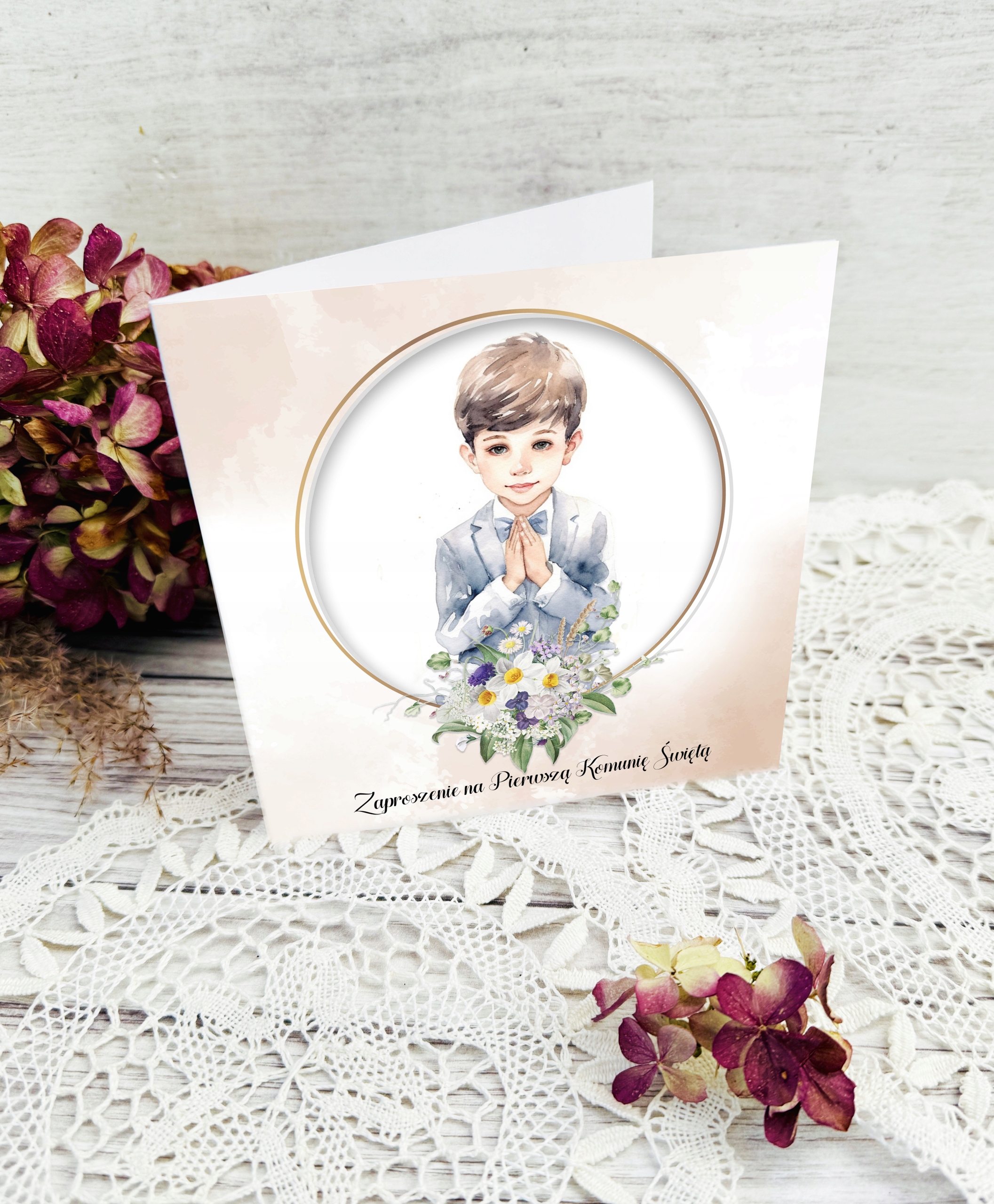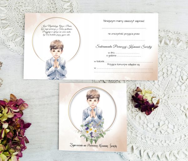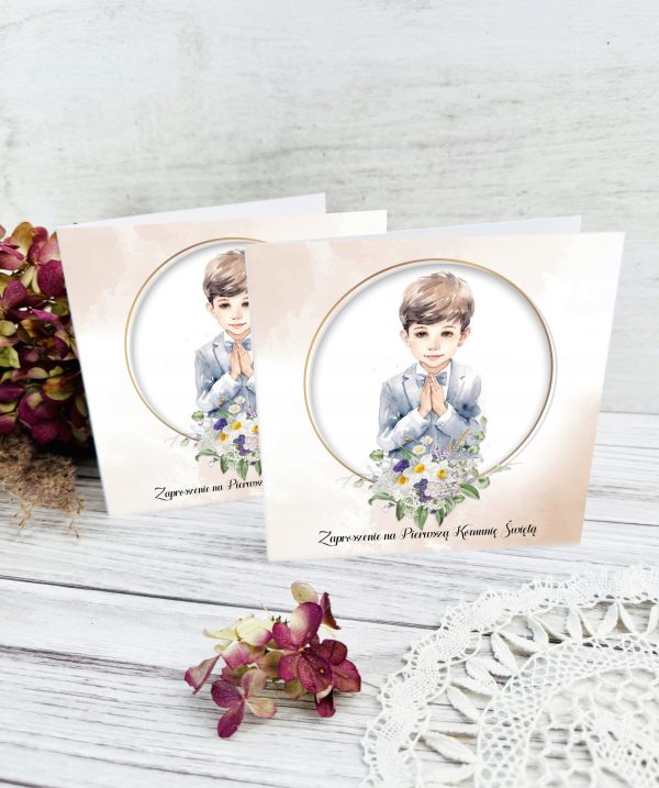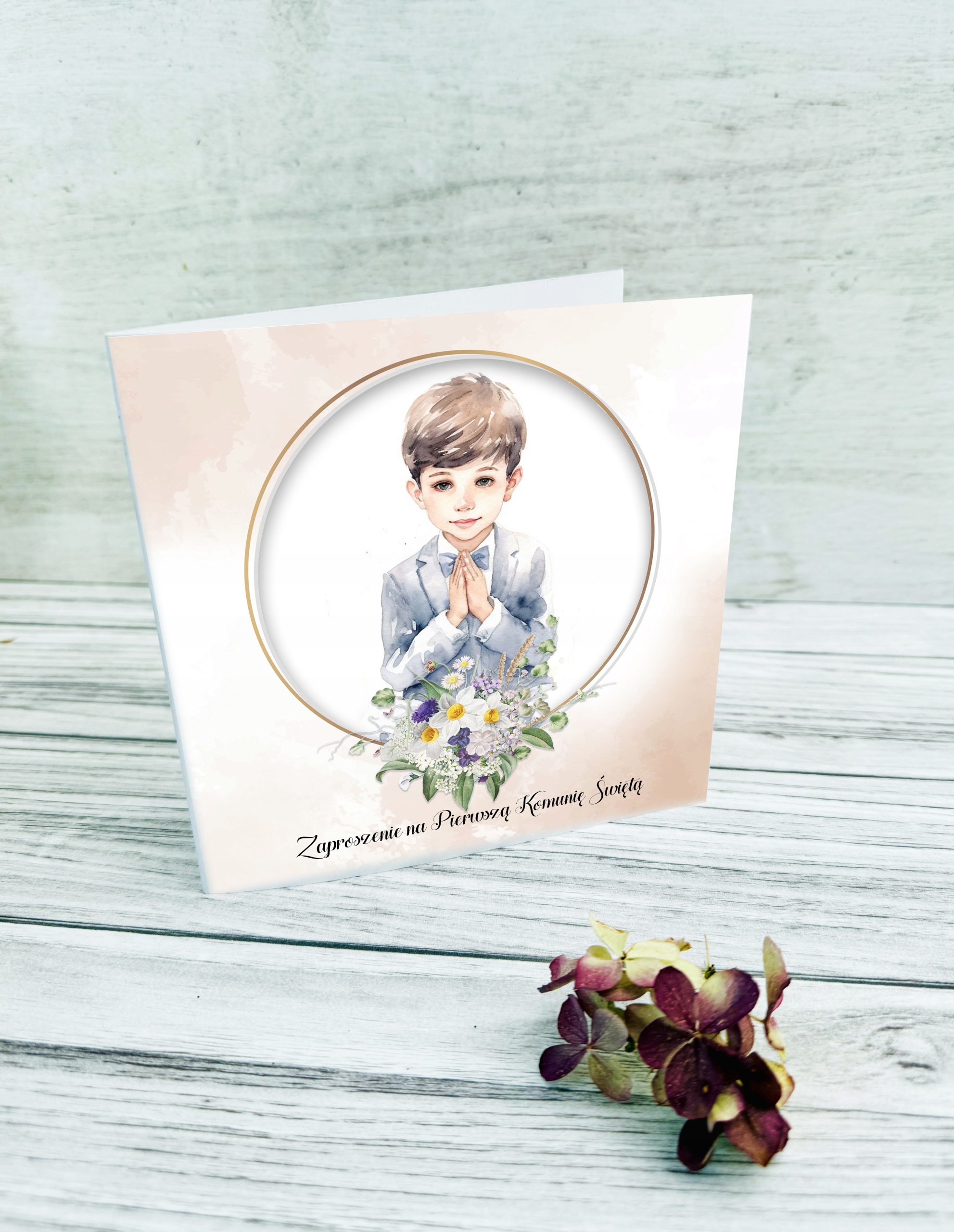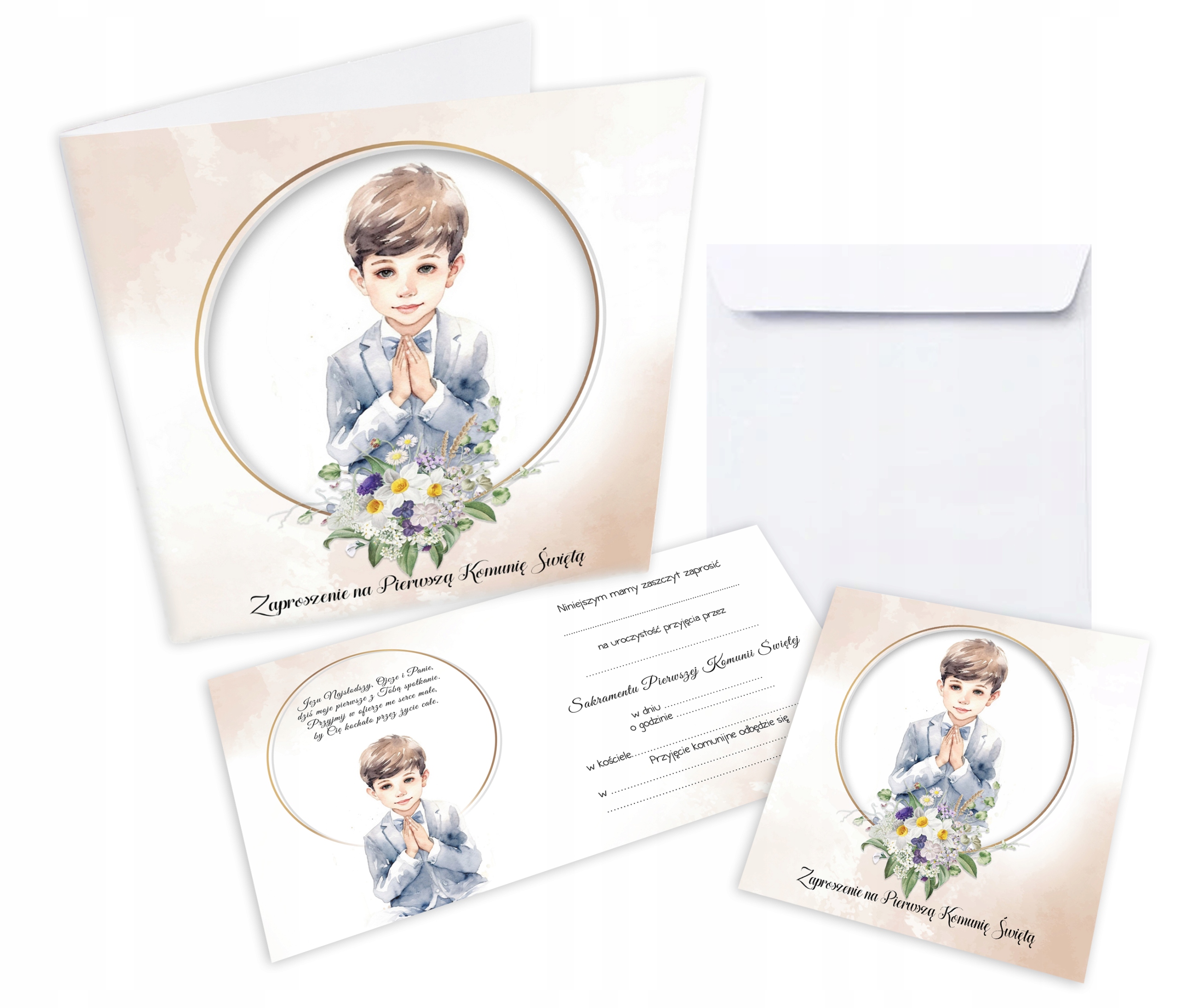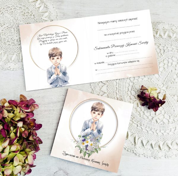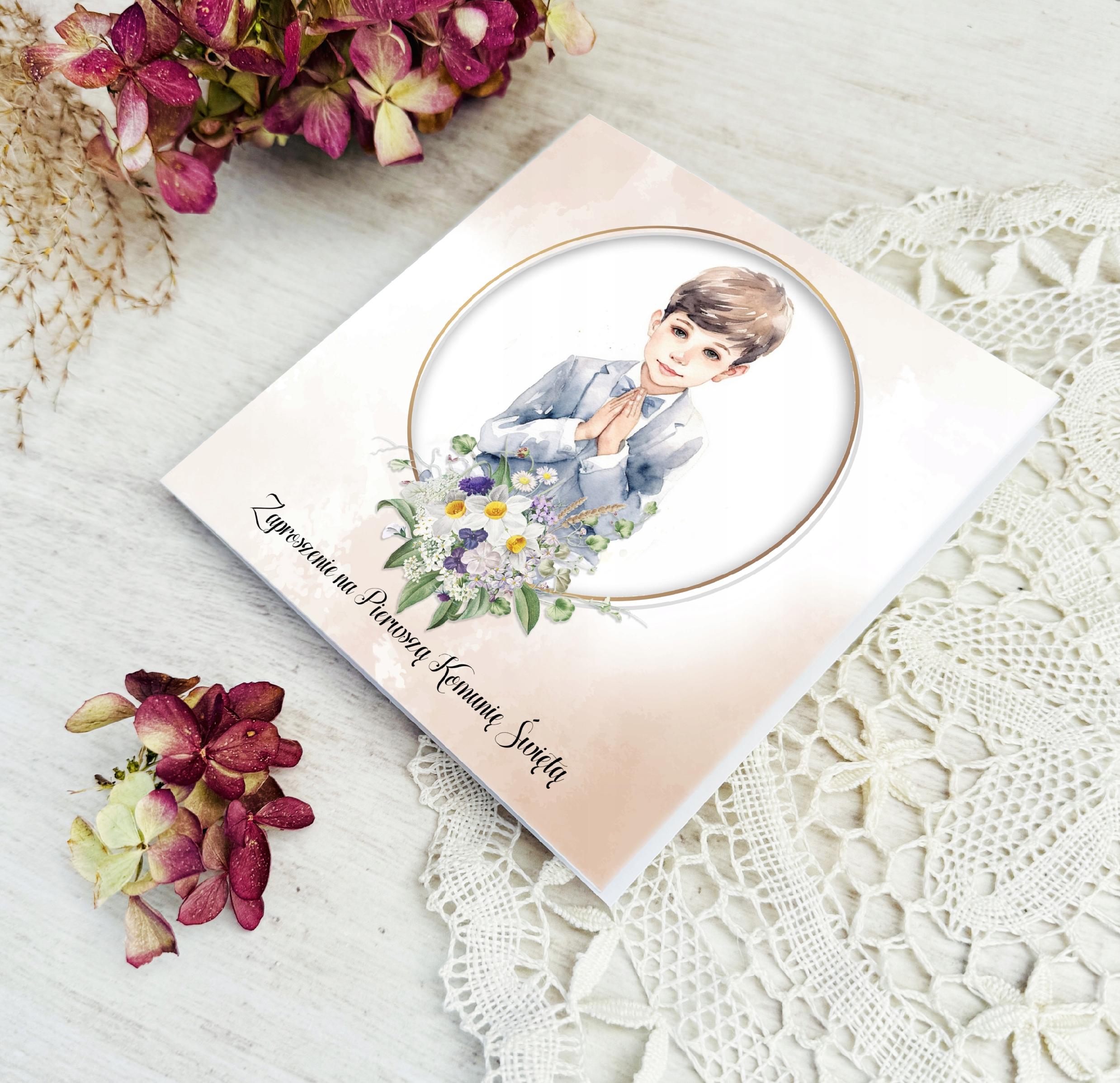 Na tej aukcji przedstawiamy ZAPROSZENIE NA PIERWSZĄ KOMUNIĘ ŚWIĘTA z wzorem przedstawiającym chłopca.