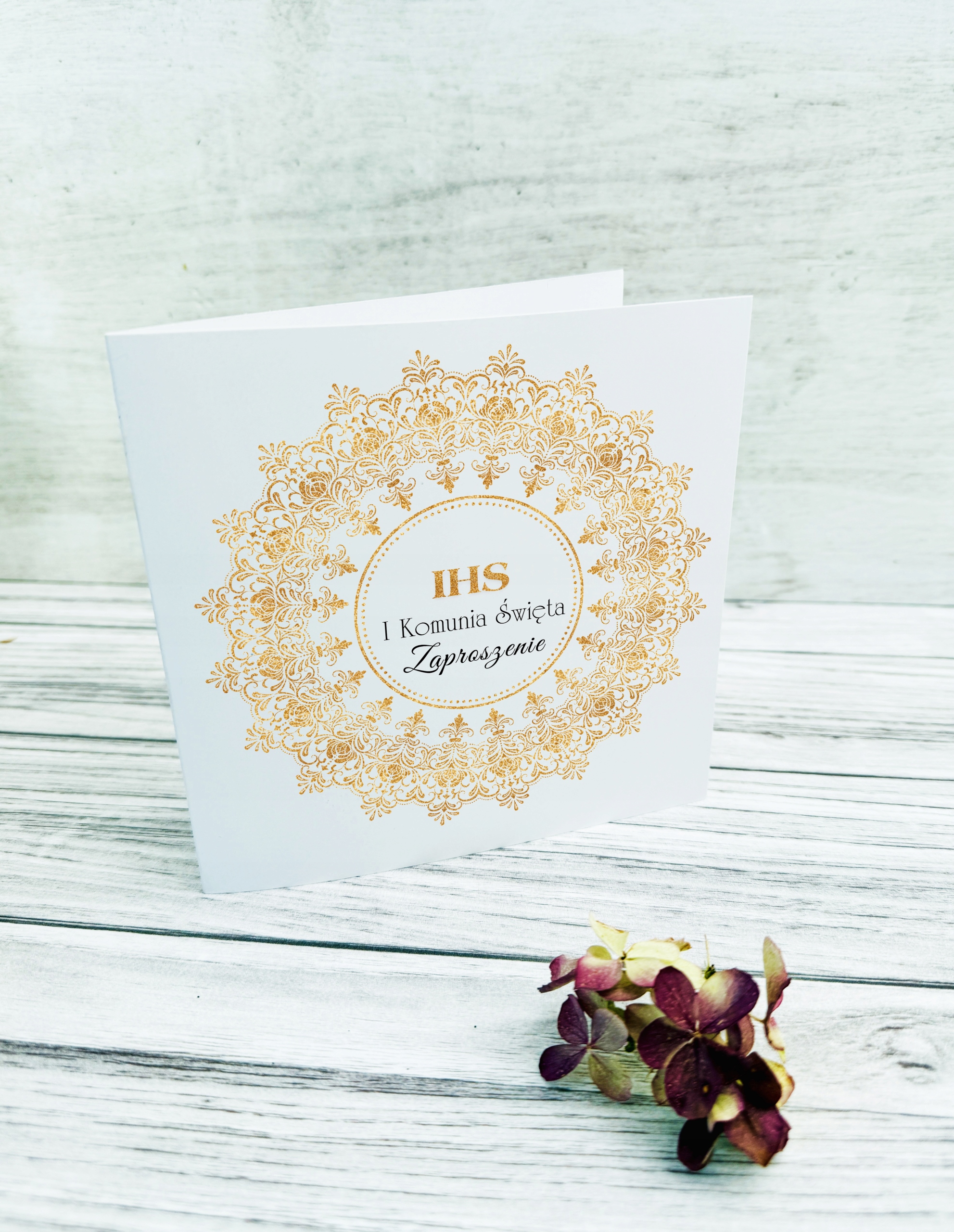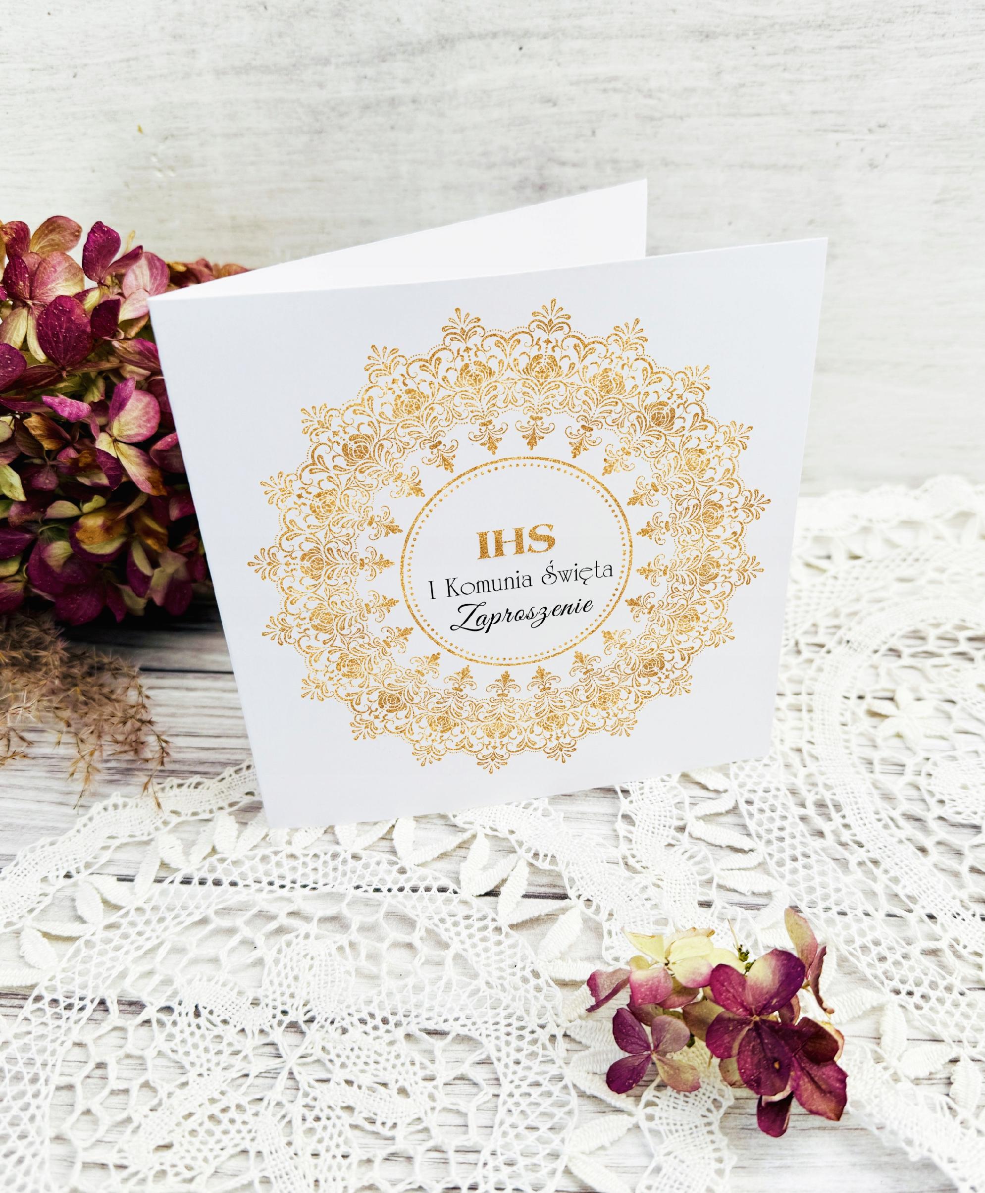 Na tej aukcji przedstawiamy ZAPROSZENIE NA PIERWSZĄ KOMUNIĘ ŚWIĘTA z wzorem przedstawiającym hostię.