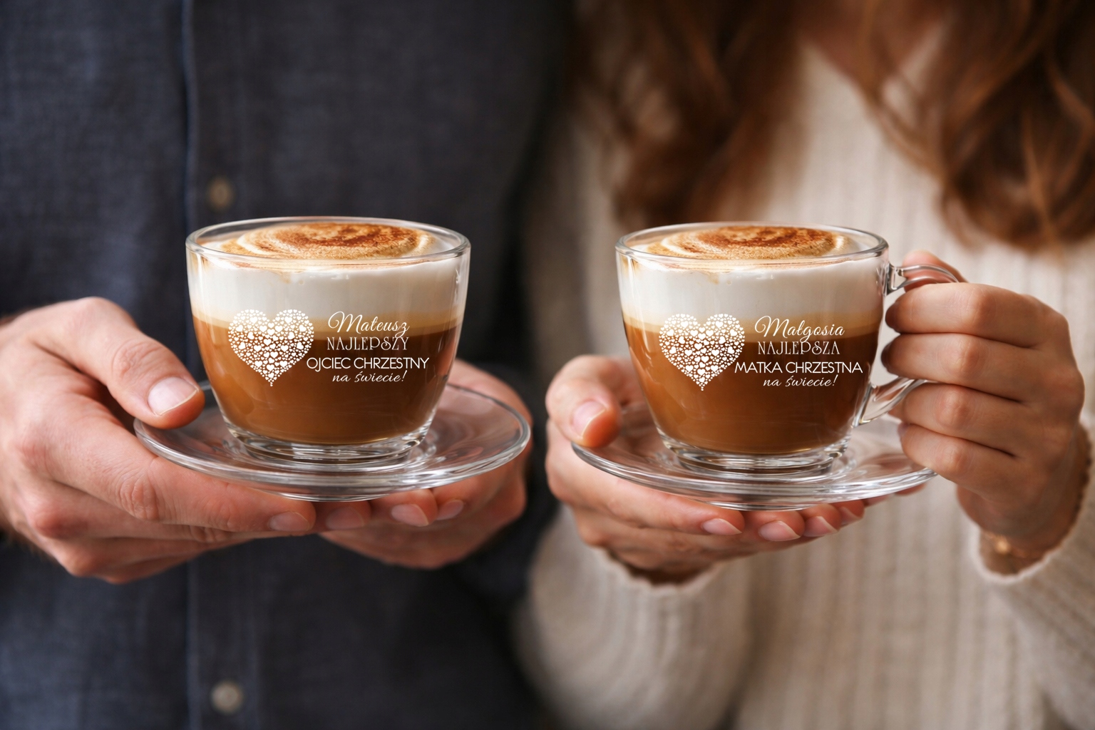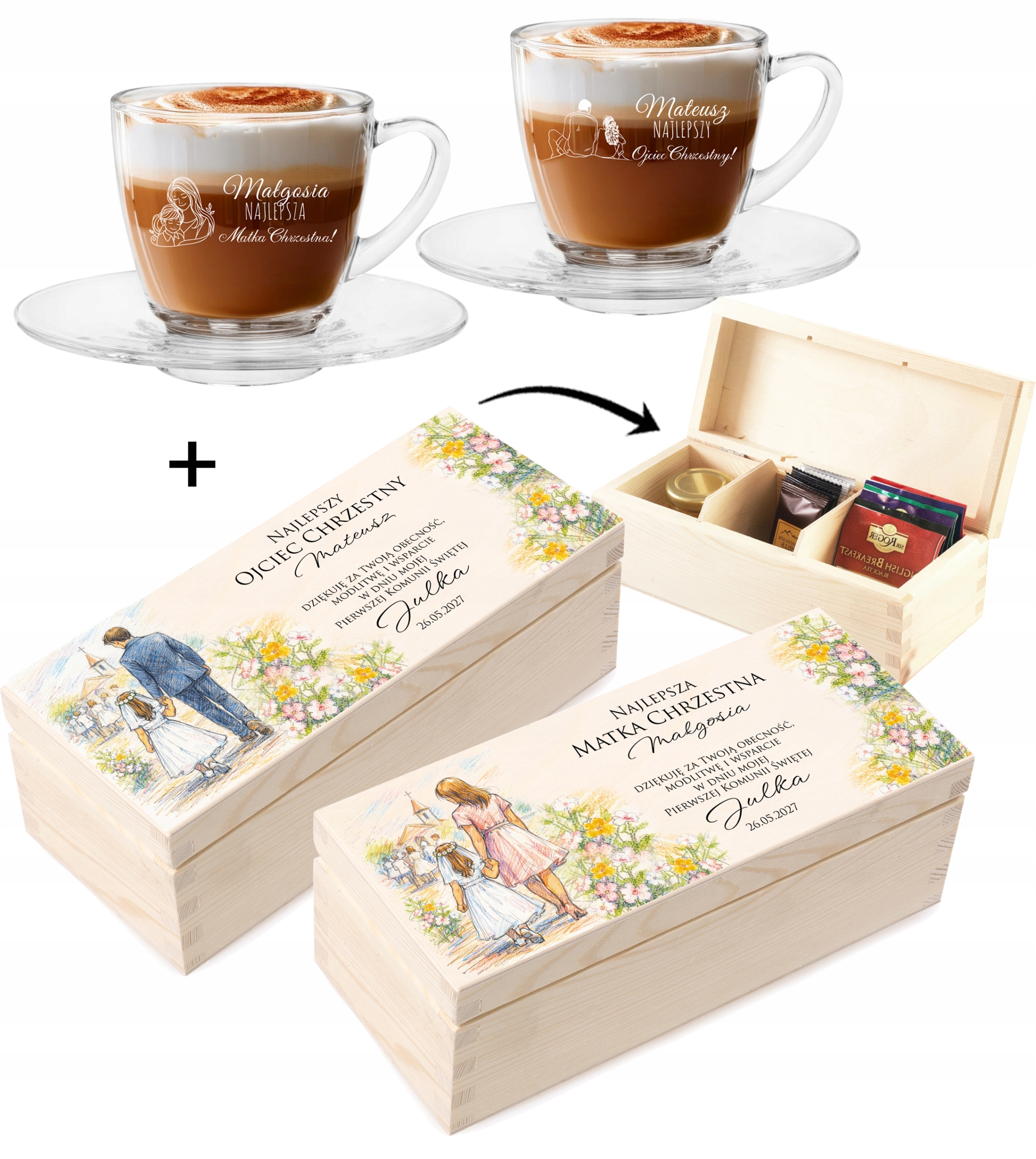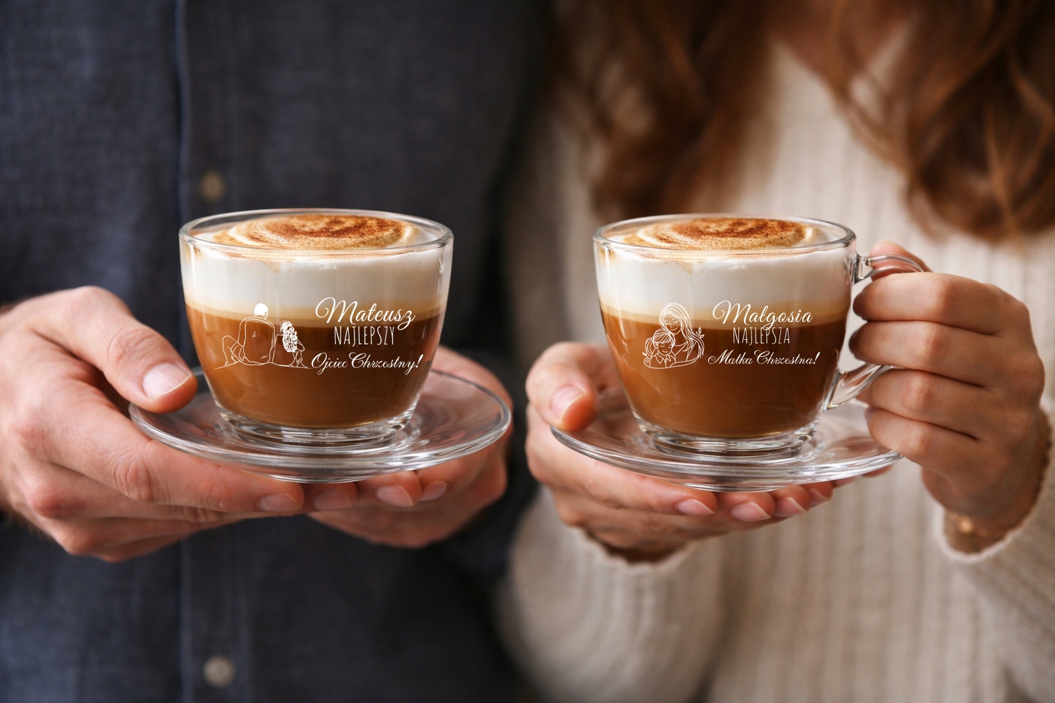 Ten wyjątkowy komplet szklanych filiżanek ze spodkiem oraz herbaciarek to piękny i pełen klasy sposób, by wyrazić wdzięczność Matce Chrzestnej i Ojcu Chrzestnemu za ich obecność, wsparcie i miłość w dniu Pierwszej Komunii Świętej. To prezent, który łączy elegancję, symbolikę oraz osobisty charakter.