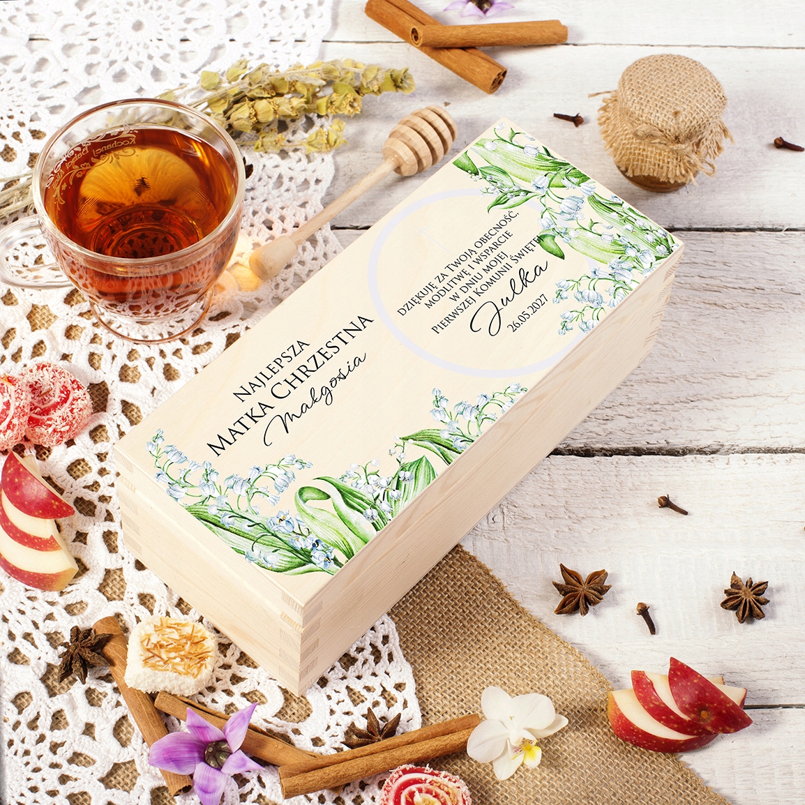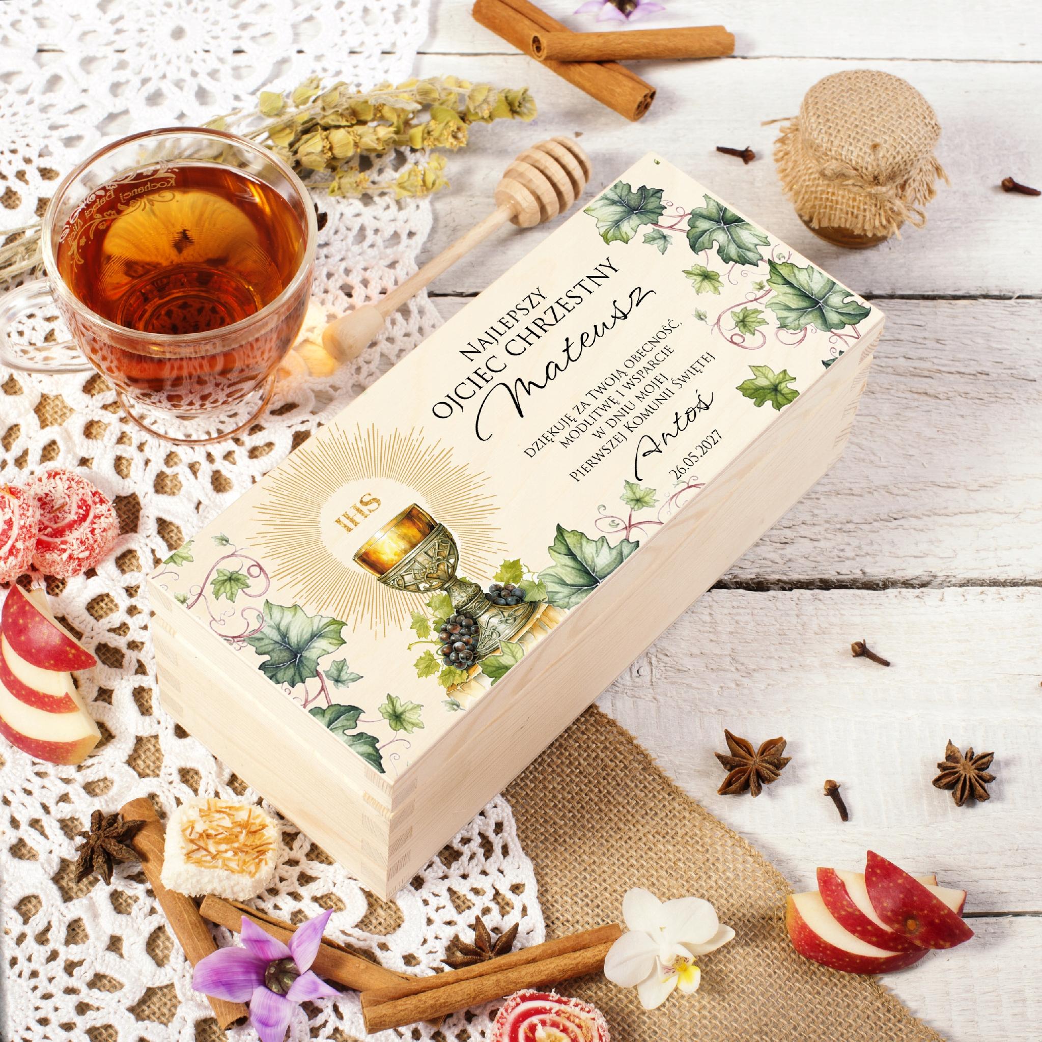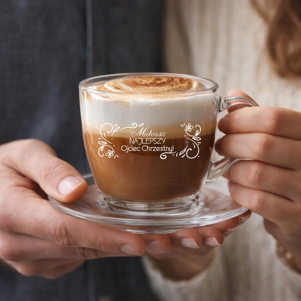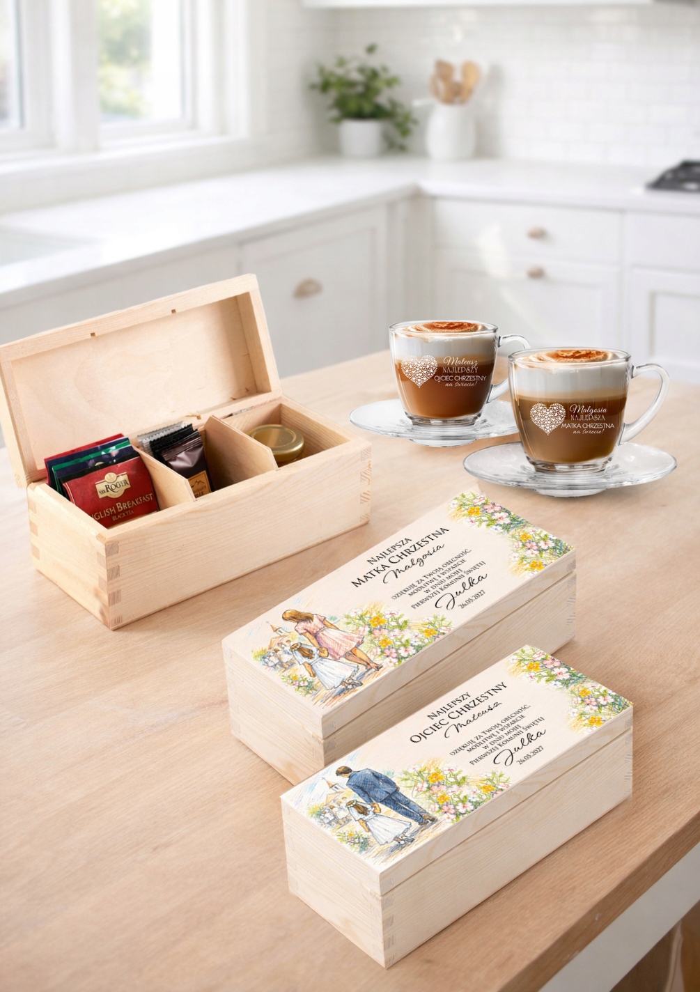 Ten wyjątkowy komplet szklanych filiżanek ze spodkiem oraz herbaciarek to piękny i pełen klasy sposób, by wyrazić wdzięczność Matce Chrzestnej i Ojcu Chrzestnemu za ich obecność, wsparcie i miłość w dniu Pierwszej Komunii Świętej. To prezent, który łączy elegancję, symbolikę oraz osobisty charakter.