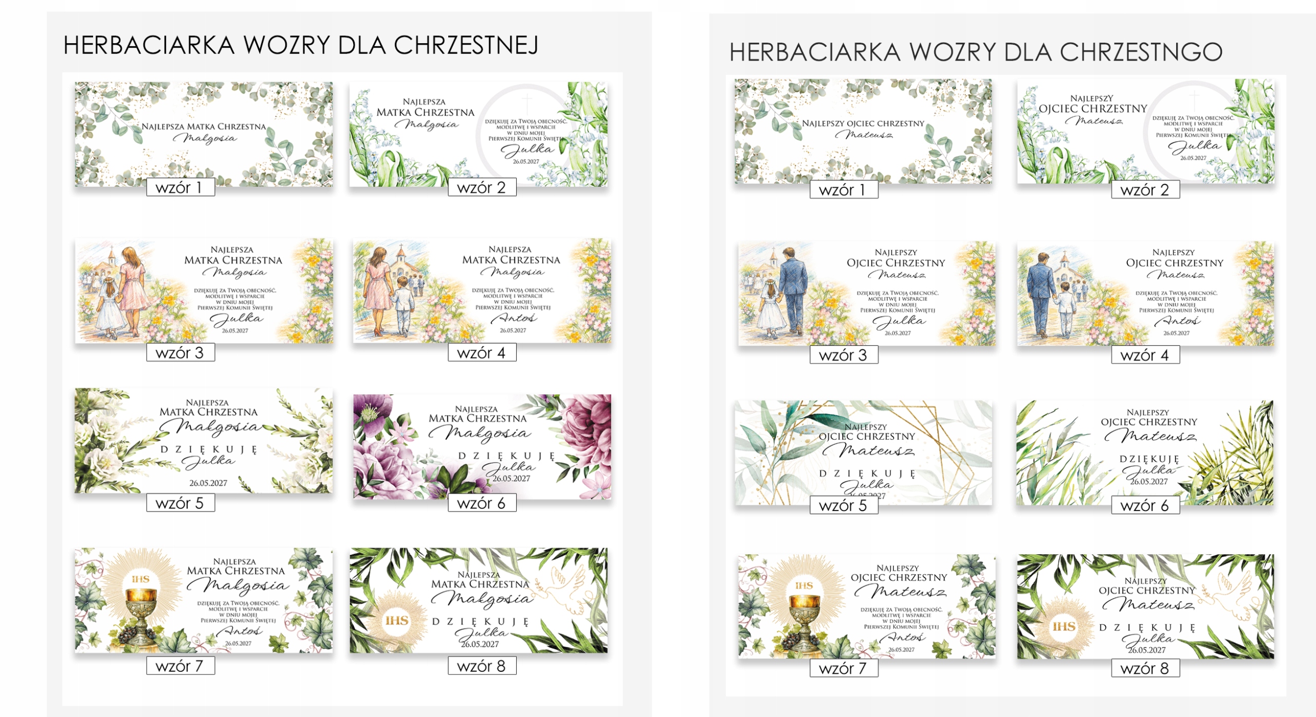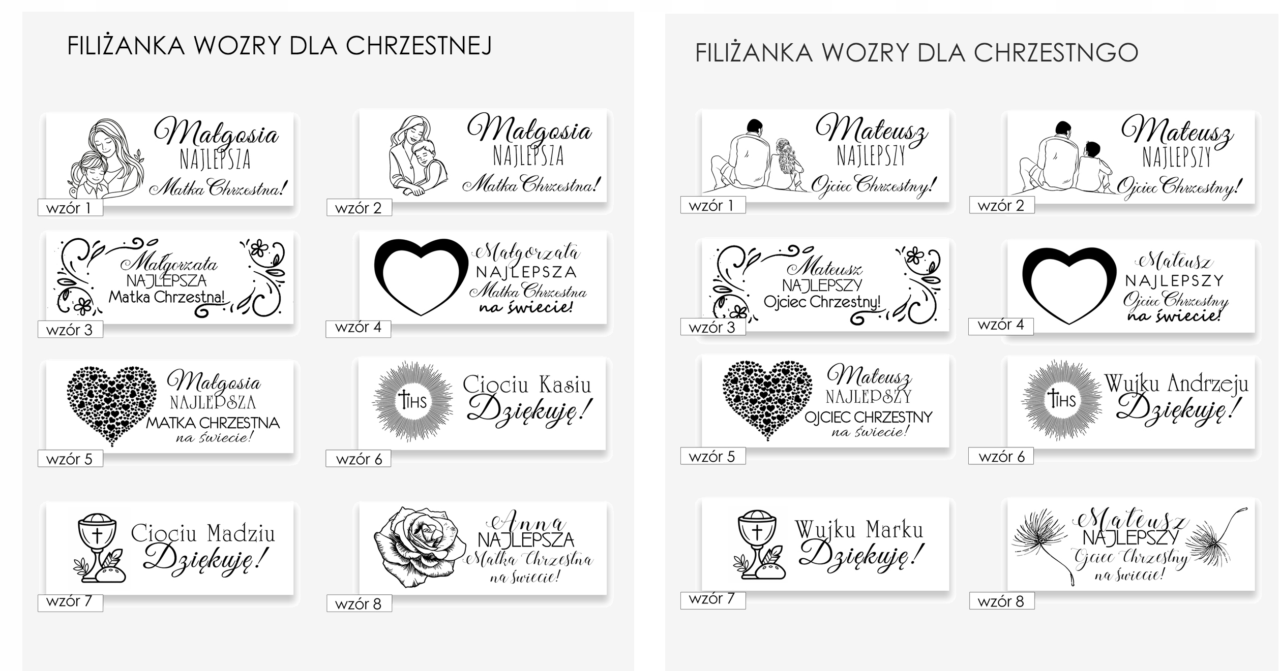 • W wiadomości do sprzedającego podaj wybrane wzory wraz z tekstem i imieniem dla filiżanek i dla pudełek