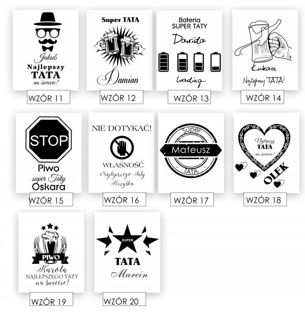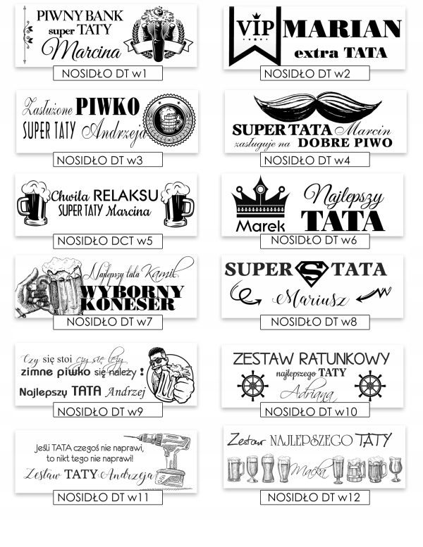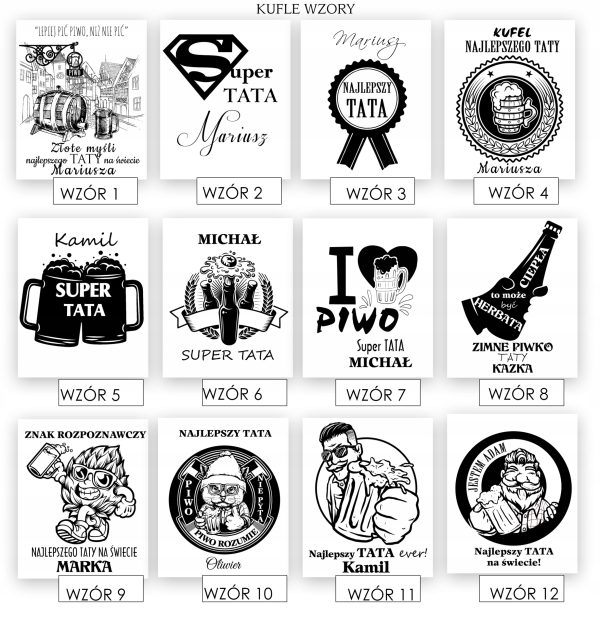 • W wiadomości do sprzedającego podaj wybrane wzory (dla nosidła i dla kufla) oraz dane do graweru – IMIĘ PODAJ W WERSJI ODMIENIONEJ np: