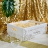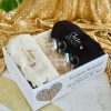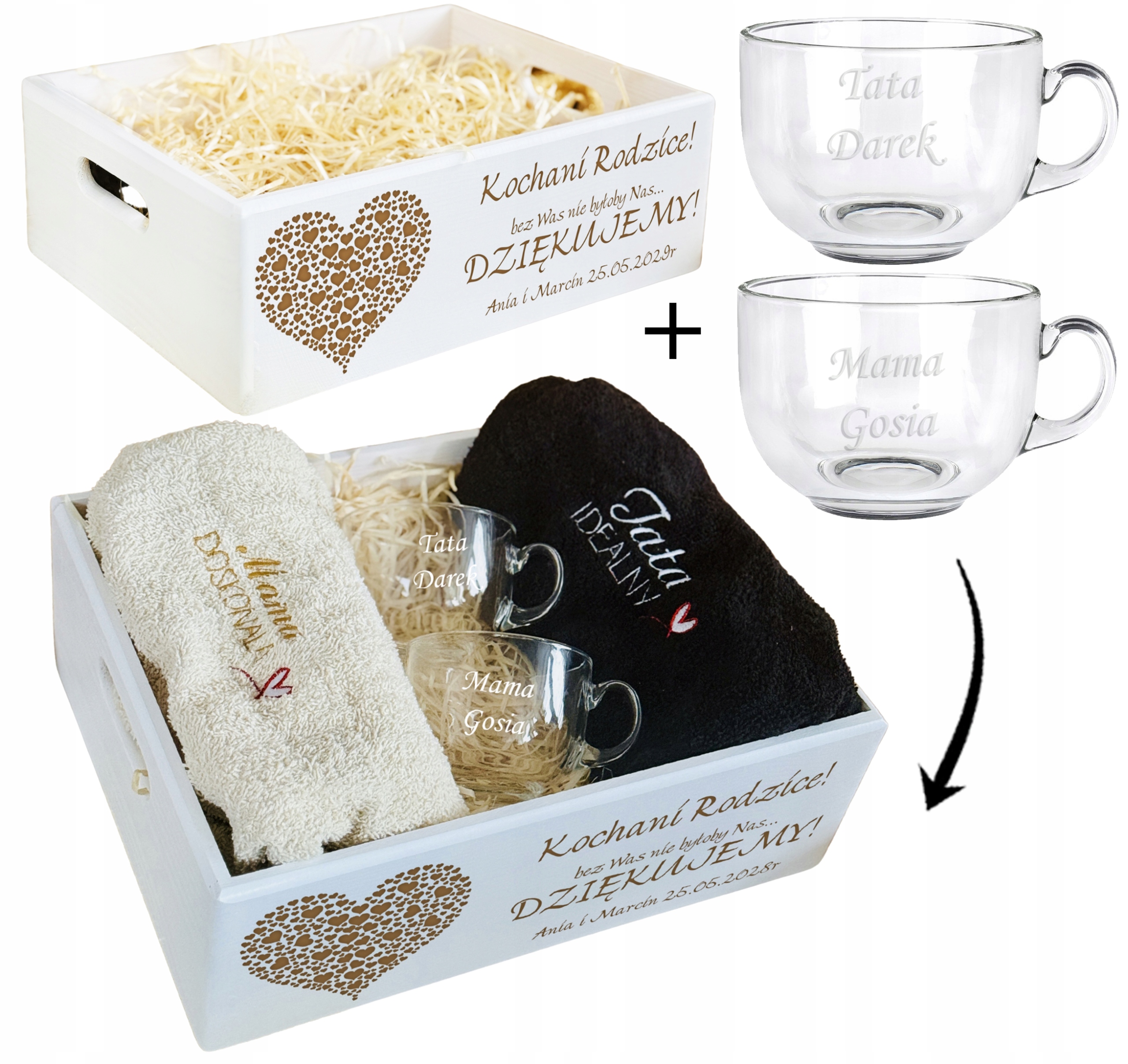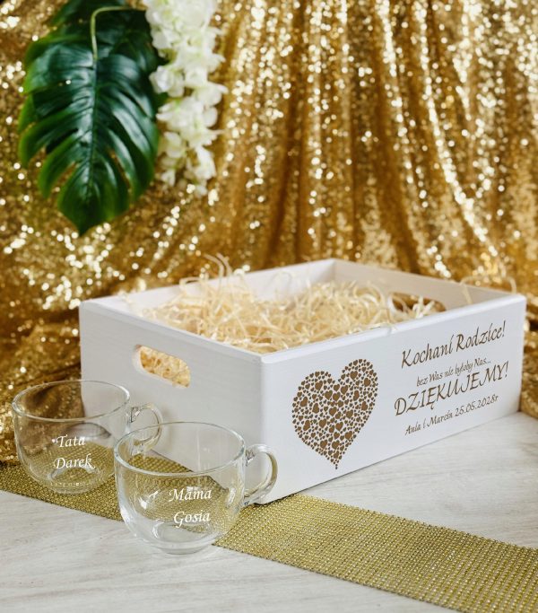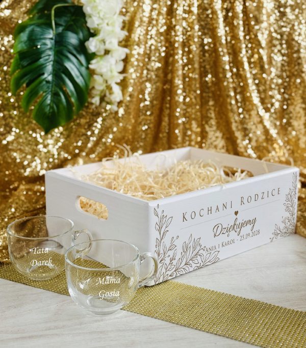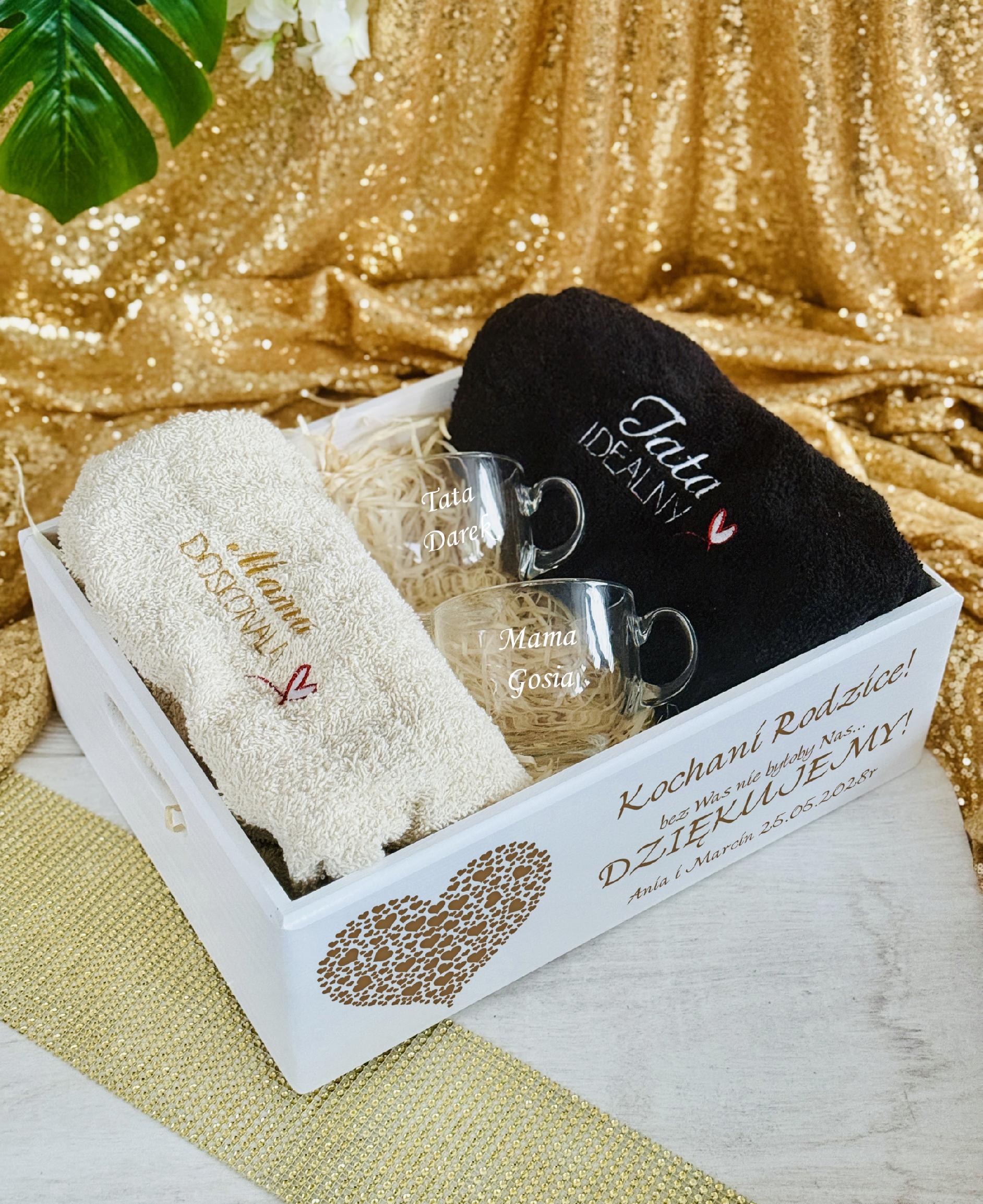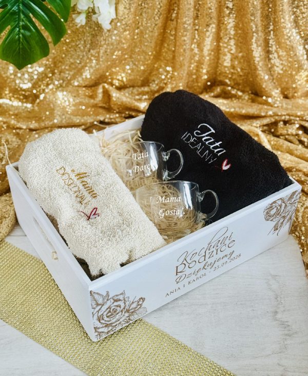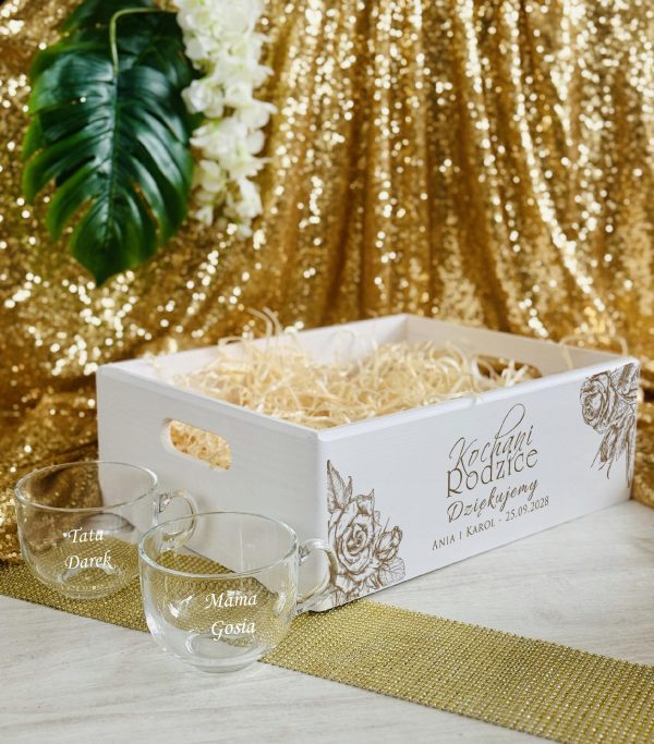 Szukasz niebanalnego sposobu, by podziękować rodzicom w dniu ślubu? Ta drewniana skrzynia prezentowa to wyjątkowy sposób, by wyrazić wdzięczność i miłość. Wykonana z naturalnego drewna, pomalowana na biało zachwyca swoją prostotą i elegancją. Wypełniona mięciutkimi ręcznikami ze specjalną haftowaną dedykacją “Mama doskonała” i “Tata idealny” oraz grawerowanymi dużymi filiżankami to oryginalny pomysł  na praktyczny upominek.