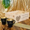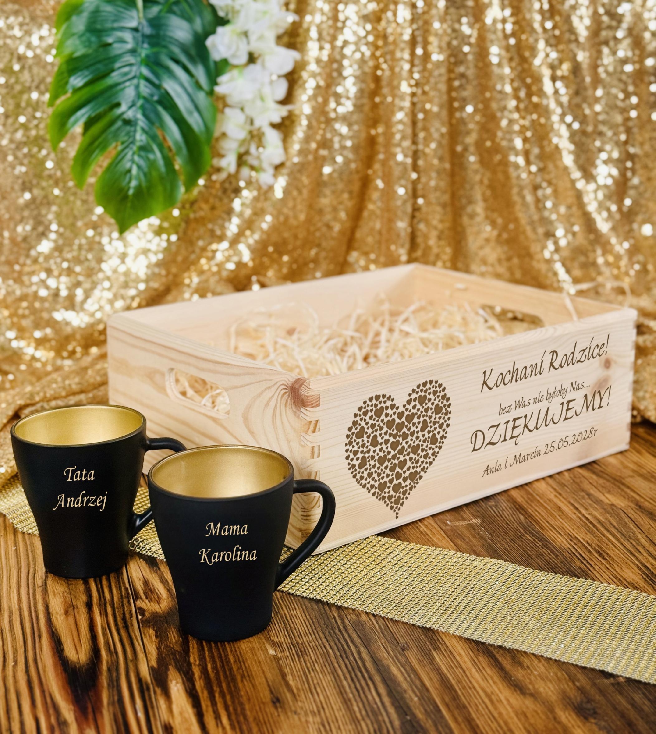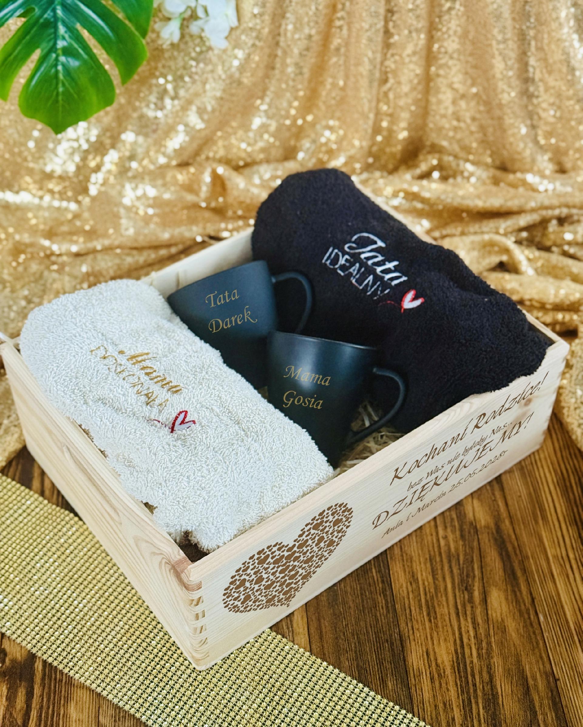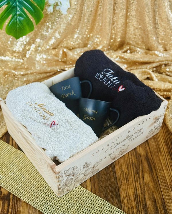Szukasz niebanalnego sposobu, by podziękować rodzicom w dniu ślubu? Ta drewniana skrzynia prezentowa to wyjątkowy sposób, by wyrazić wdzięczność i miłość. Wykonana z naturalnego drewna, zachwyca swoją prostotą i elegancją. Wypełniona mięciutkimi ręcznikami ze specjalną haftowaną dedykacją “Mama doskonała” i “Tata idealny” oraz grawerowanymi kubkami to oryginalny pomysł  na praktyczny upominek.