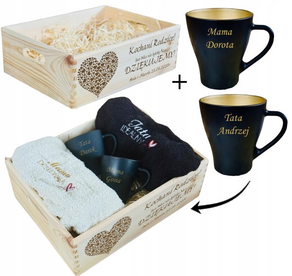 ZESTAW UPOMINKOWY dla RODZICÓW duży SKRZYNIA ręczniki kubki czarne + GRAWER