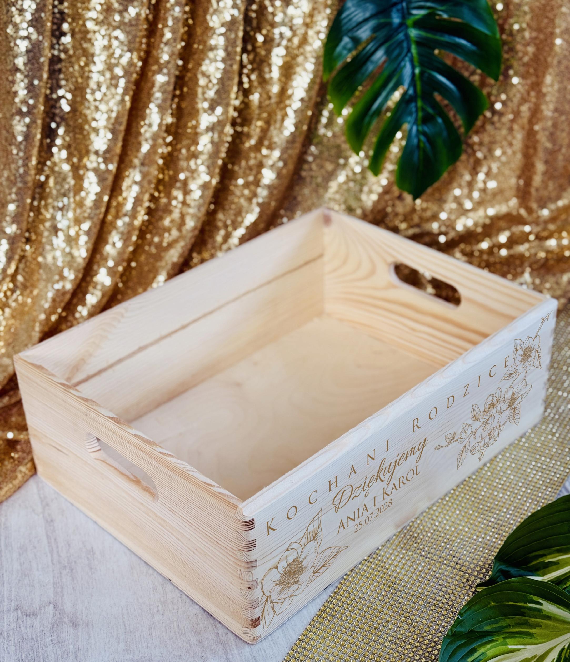 ✅ Personalizacja – możliwość dodania imion, daty ślubu lub dedykacji na skrzyni