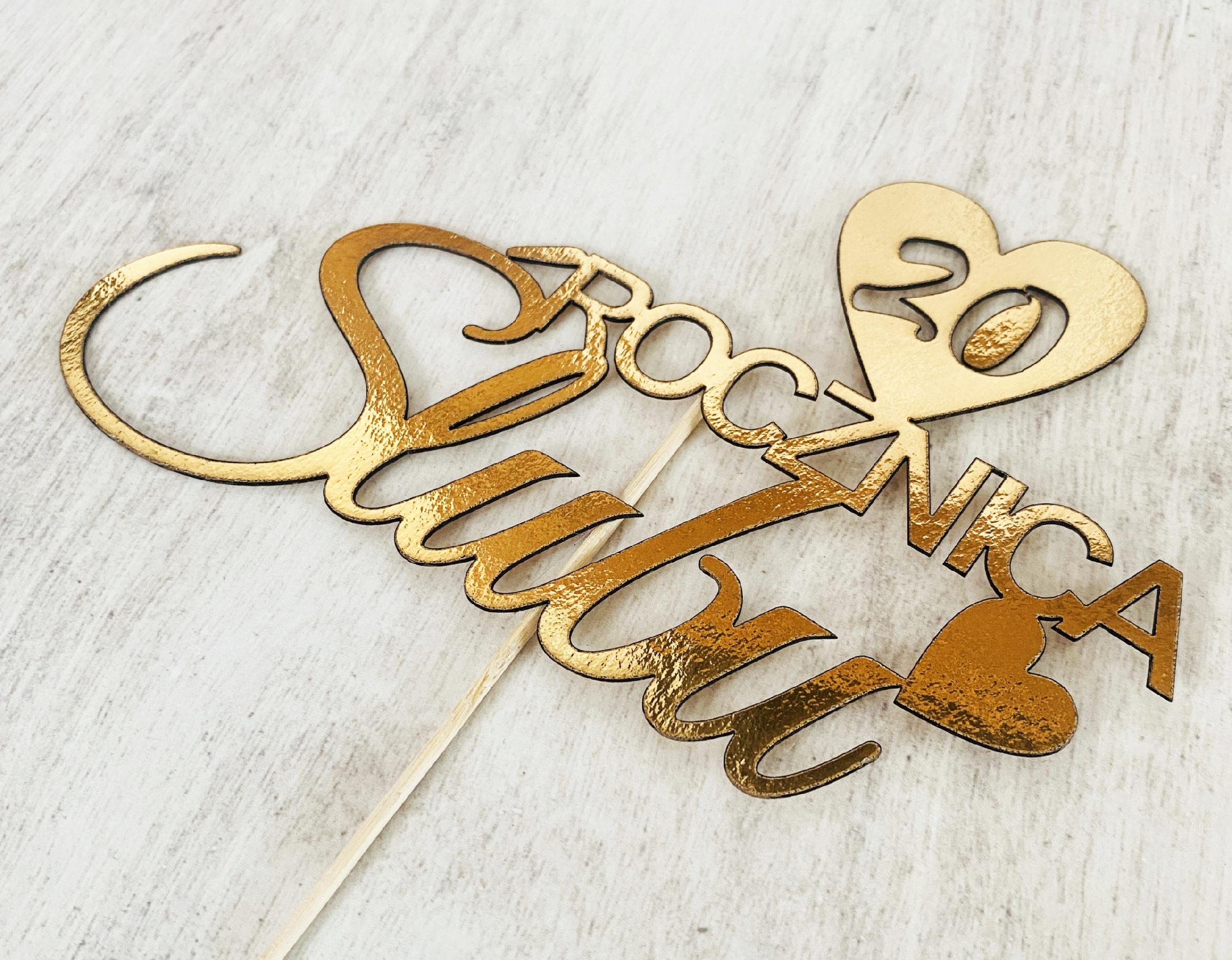 Rocznica ślubu to wyjątkowa okazja do świętowania, oraz wspólnego celebrowania miłości i zaangażowania, jakie oboje małżonkowie włożyli w swój związek. Aby jeszcze bardziej sprawić by ten dzień był wyjątkowy uświetnij go pięknym tortem zwieńczonym cudownym błyszczącym topperem. Nasz topper pięknie uzupełni każdy tort rocznicowy. Wybierz go, aby uczcić ten szczególny dzień i uczynić go jeszcze bardziej wyjątkowym!